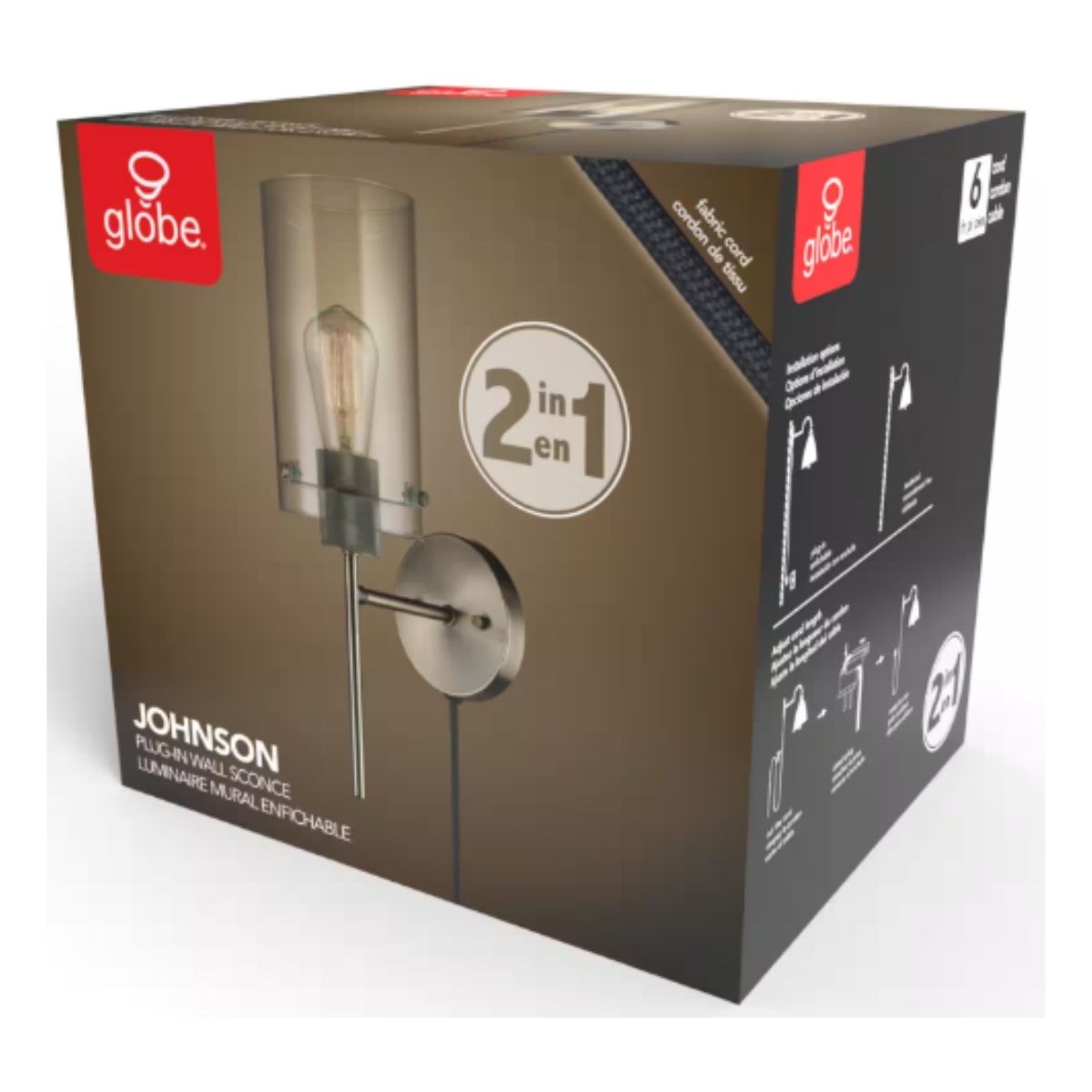 The Johnson Plug-In or Hardwire Wall Sconce from Globe Electric is a fantastic choice for enhancing the ambiance of any space. Featuring a timeless design complemented by an antique brass finish, clear glass shade, and exposed bulb, this sconce adds a touch of elegance to any room.