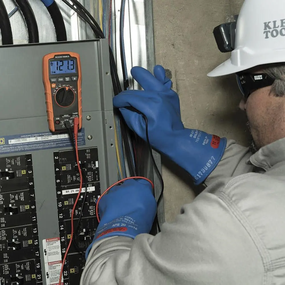 The Klein Tools MM420 Multimeter is an auto-ranging true root mean square (TRMS) device designed for accurate measurement of AC/DC voltage, AC/DC current, and resistance. It also measures temperature, capacitance, frequency, duty cycle, and tests diodes and continuity. Exclusively designed for electricians, this multimeter incorporates features inspired by extensive field research and electrician feedback, ensuring reliability and ease of use on every job.