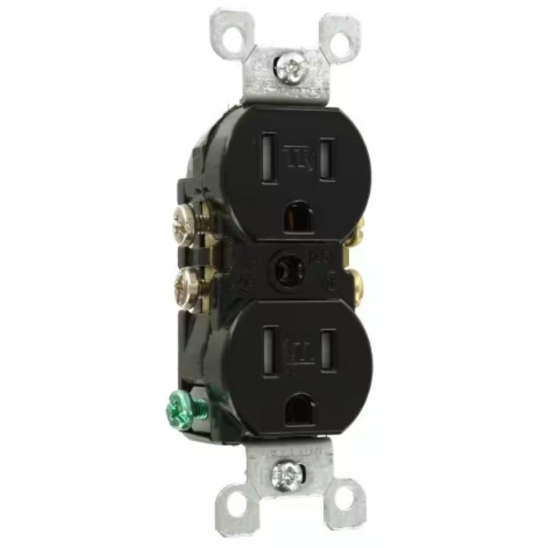 The Leviton 15 Amp Tamper-Resistant Duplex Outlet in Black combines safety with style, designed for both functionality and aesthetics. This outlet features tamper-resistant shutters that prevent the insertion of foreign objects, enhancing safety for children and reducing electrical hazards. Rated for 15 amps, it fits standard electrical boxes and is compatible with 120V circuits. The sleek black finish offers a modern look that complements contemporary decor. Ideal for residential and commercial use, it meets rigorous safety standards and ensures reliable performance. Dimensions Outlet Depth (in.):4.2 Outlet Height (in.):1 Outlet Width (in.):1.55 Details Amperage (A):15 A Color Family:Black Commercial/Residential:Residential Configuration:Standard Device Style Type:Outlet w/o Wall Plate Durability:Tamper Resistant Electrical Features:No Additional Features Grounding:Grounded Included:Mounting Hardware Indoor/Outdoor:Indoor Maximum Amperage (A):15 A Mounting Type:In-Wall NEMA Configuration:NEMA 5 Number of Outlets:2 Number of Poles:2 Outlet Configuration:Duplex Outlet Location:Wall Outlet Material:Thermoplastic Outlet Type:Not Protected Package Quantity:1 Plug Configuration:5-15 Rating:Tamper Resistant Receptacle Configuration:5-15 UL Listing:1-UL Listed Voltage:125 volt Voltage (V):125 V Wall Plate Configuration:Duplex Outlet Wire Connection Location:Back, Side Wire Connection Type:Screw Terminal