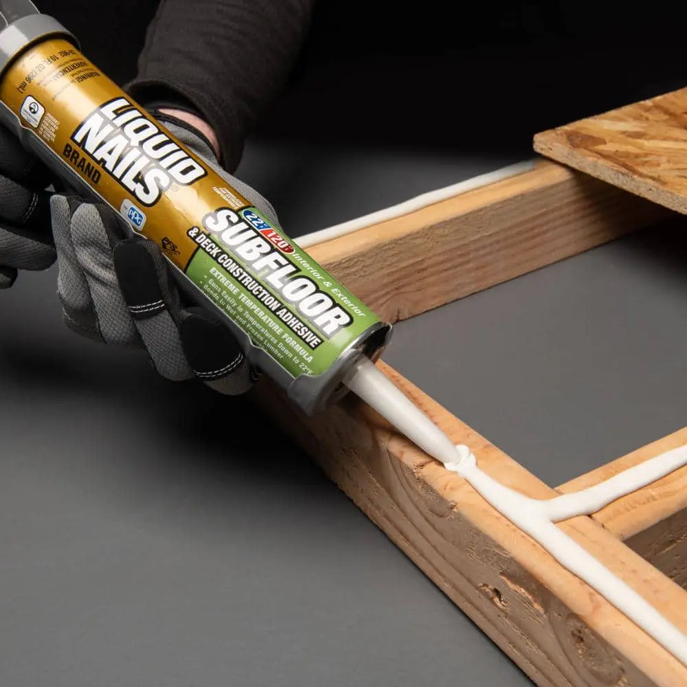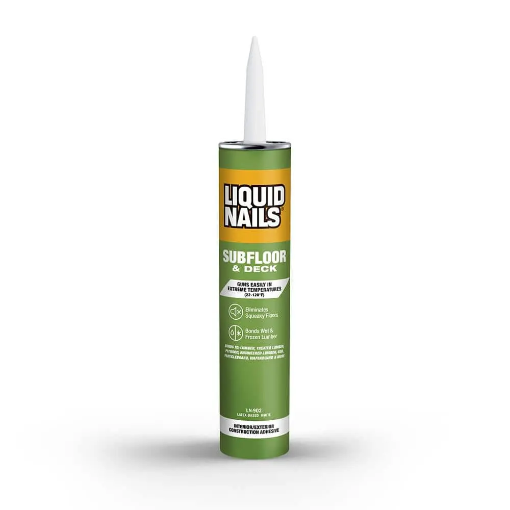 Ensure a strong, durable bond for subfloors and decks with Liquid Nails Subfloor and Deck Construction Adhesive. Its low VOC formula makes it safer for both indoor and outdoor use while providing a moisture-resistant seal for long-lasting performance. Designed to reduce floor squeaks, it securely bonds wood-to-wood and wood-to-metal connections. The 10 oz. cartridge allows for precise application, and its extreme temperature resistance ensures reliable use in various weather conditions