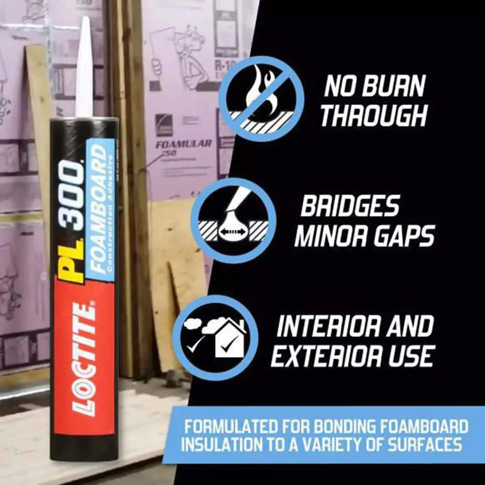 Loctite PL 300 Foamboard 10 oz. Latex Construction Adhesive offers a strong, reliable bond for a variety of materials. The 10 oz. cartridge allows for easy application, while the latex-based formula ensures a durable and lasting bond. Its blue color makes it easy to identify and ensures a clean, controlled application. This adhesive works well on foamboard, drywall, wood, and more, making it versatile for different projects. With its water-resistant properties, it’s ideal for use in various environments. The low-odor formula is safer for indoor use, and its fast-setting nature allows for quick, efficient bonding
