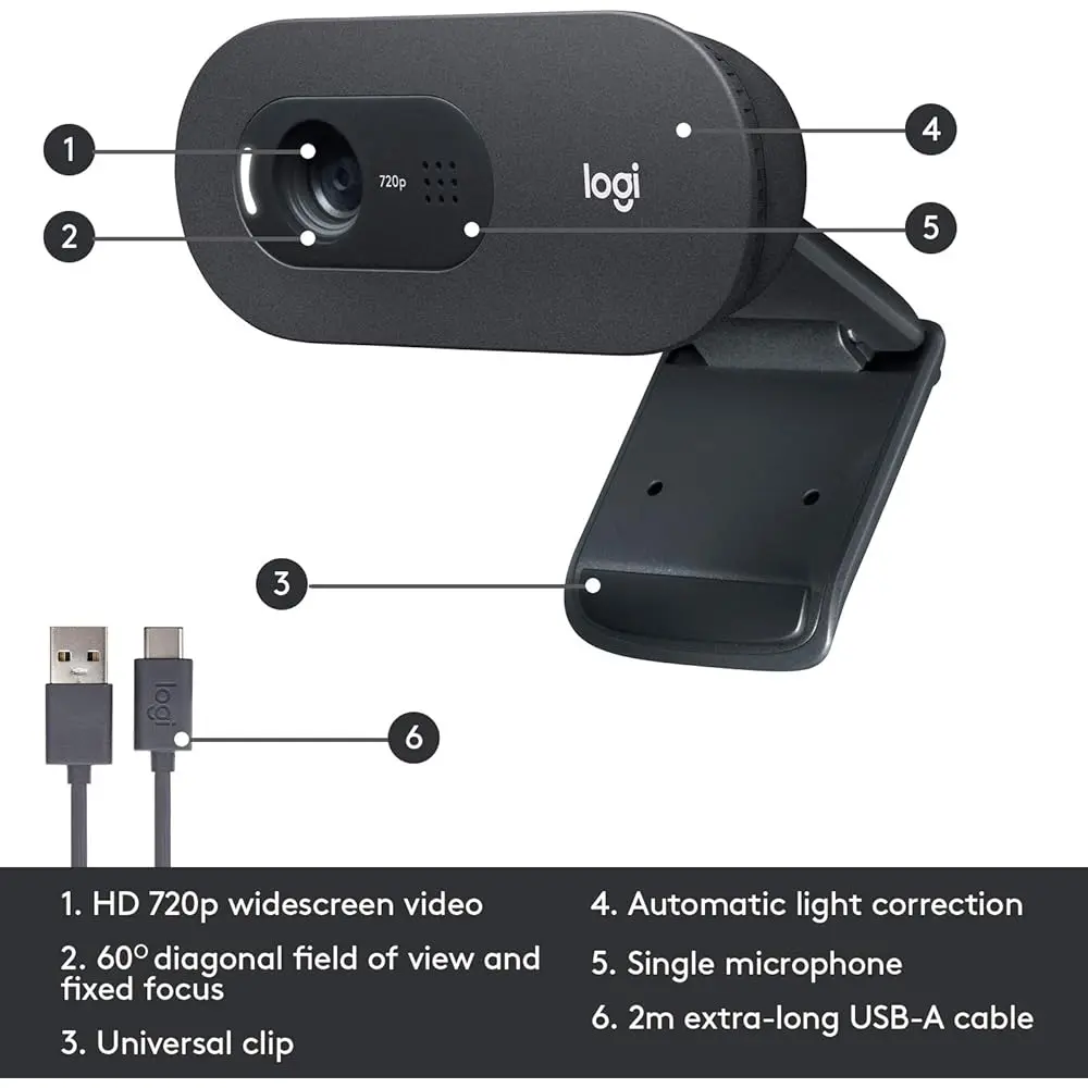 Upgrade from your laptop's built-in camera with a webcam that offers sharp, smooth, and vibrant widescreen HD 720p video. It features a 60° diagonal field of view, fixed focus, and auto light correction that adjusts to the lighting in any meeting environment. The omnidirectional microphone with noise-reduction technology ensures clear, natural conversations up to 3 meters away, even in noisy spaces like open offices and classrooms. The extra-long USB-A cable and universal clip allow flexible placement, mounting the webcam on your computer or positioning it up to 7 ft (2 m) away.
