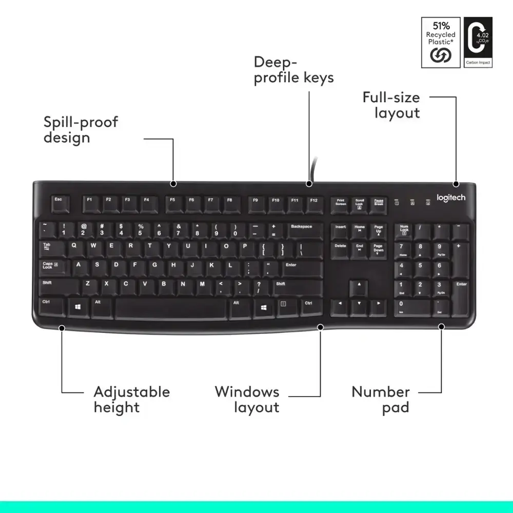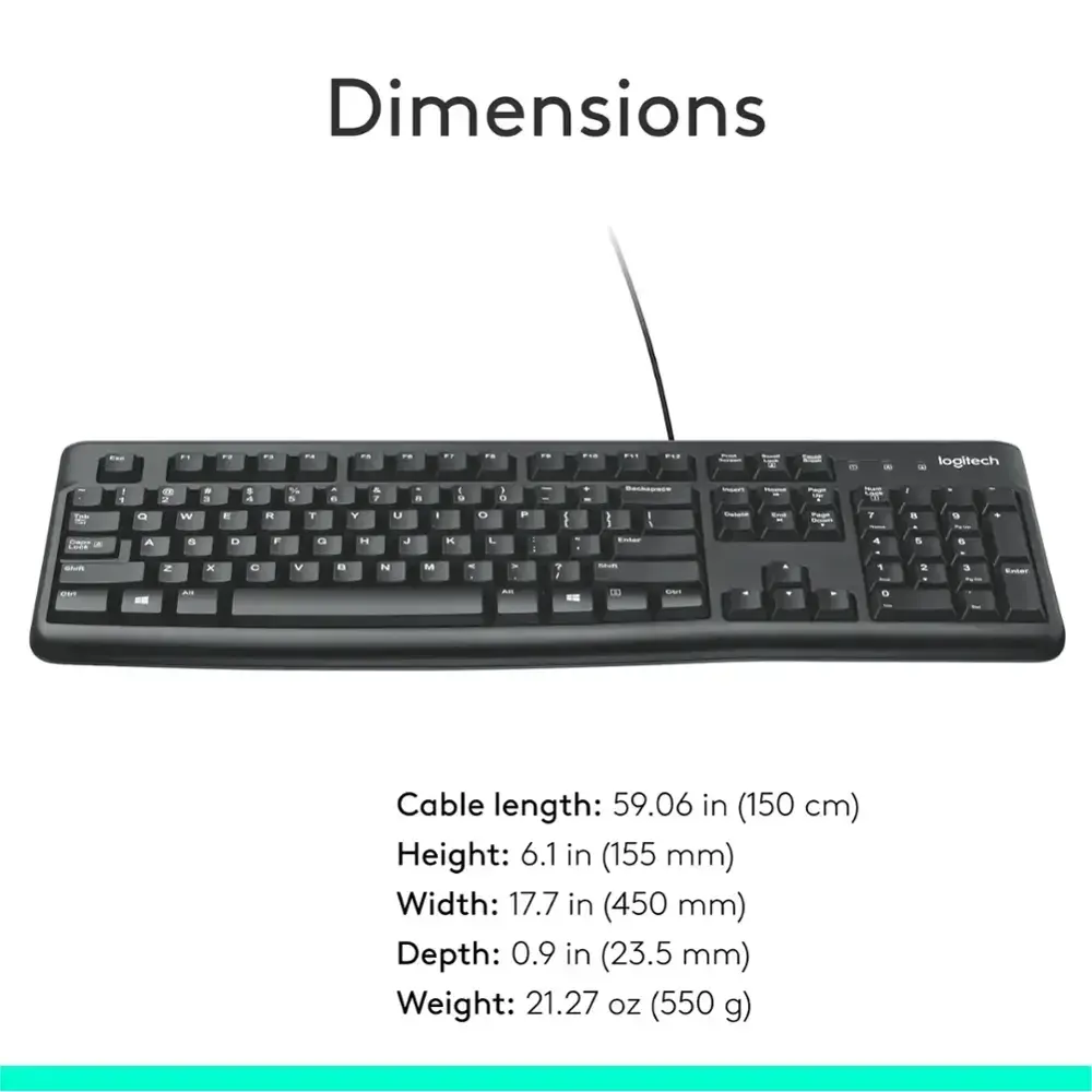 The Logitech Keyboard K120 offers a comfortable and quiet typing experience with its low-profile keys and standard layout, including full-size F-keys and a number pad. Designed for durability, this keyboard features a spill-resistant design, keys that can withstand up to 10 million keystrokes, and sturdy, adjustable tilt legs. Its sleek, thin profile not only looks good but is built to last. Setup is simple—just plug it into a USB port, and it’s ready to use right out of the box. The bold, bright white characters on the keys make them easy to read. As a product of Logitech’s renowned quality and reliability, this keyboard is perfect for both home and office use.