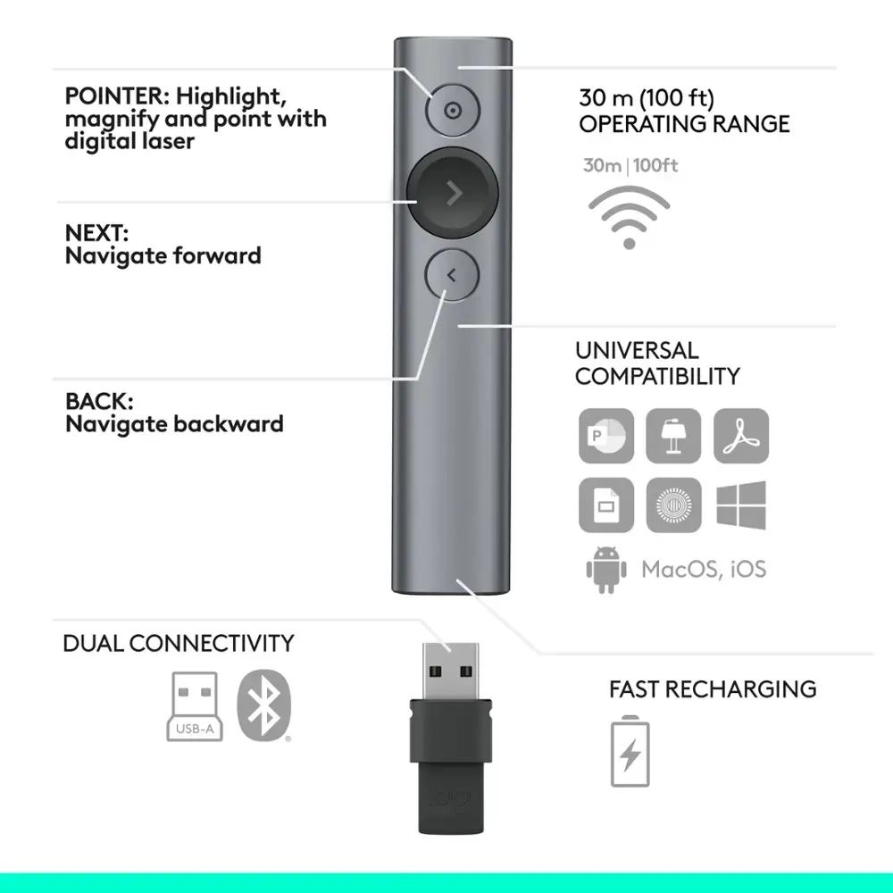The Logitech Spotlight Presentation Remote - Slate offers a powerful and flexible tool for presenters, with an impressive 100 ft range allowing you to move freely around the room. Its quick charging feature ensures you get up to 3 hours of use after just 1 minute of charging, keeping you ready for any presentation. The precision pointer lets you highlight or magnify areas on your screen for emphasis, while customizable buttons allow you to tailor the controls to suit your presentation style. The rechargeable battery eliminates the need for disposable batteries, and its USB receiver and Bluetooth compatibility provide versatile connection options. Designed for comfort, the ergonomic design ensures ease of use during extended sessions