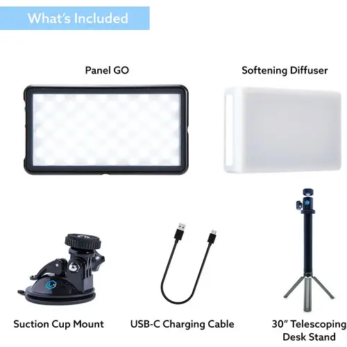 The Panel GO Bi-Color LED Light Panel Broadcast Lighting Kit from Lume Cube combines the compact Panel GO LED light with a desktop stand, a suction cup, and a 6' USB Type-C charging cable. Designed for video, photo, and webcam use, the Panel GO features a 3200 to 5600K adjustable color temperature, 112 bi-color LEDs, and 1 to 100% dimming in increments of 5%. The maximum brightness output is 1050 lux when measured at 1.8'. An intelligent LCD on the rear of the Panel GO displays the color temperature, brightness level, remaining runtime, and battery level. At 100% brightness, the light runs for approximately 1.3 hours, and at 50% for 2.3 hours. The Panel GO is charged via its USB Type-C port and can be used while charging. Design features include an aluminum build, a built-in diffusion panel, and side control buttons. The Broadcast Light Kit's included desktop stand telescopes from 6 to 30" and features a 360° rotating ball head for optimal positioning. The included suction cup can be used to mount the Panel GO on your desktop or laptop. Features Compact, slim LED for broadcast, webcam, or vlogging use LED panel with 112 bicolor LEDs Desktop stand extends from 6 to 30" 360° ball head for optimal positioning Desktop/laptop suction cup mount 3200 to 5600K adjustable color temperature CRI of 96+ for accurate color rendering 1 to 100% brightness 1050 lux brightness at 1.6' LCD panel displays color temperature, brightness level, remaining runtime, and battery level USB Type-C charging; can charge while in use Built-in diffusion panel