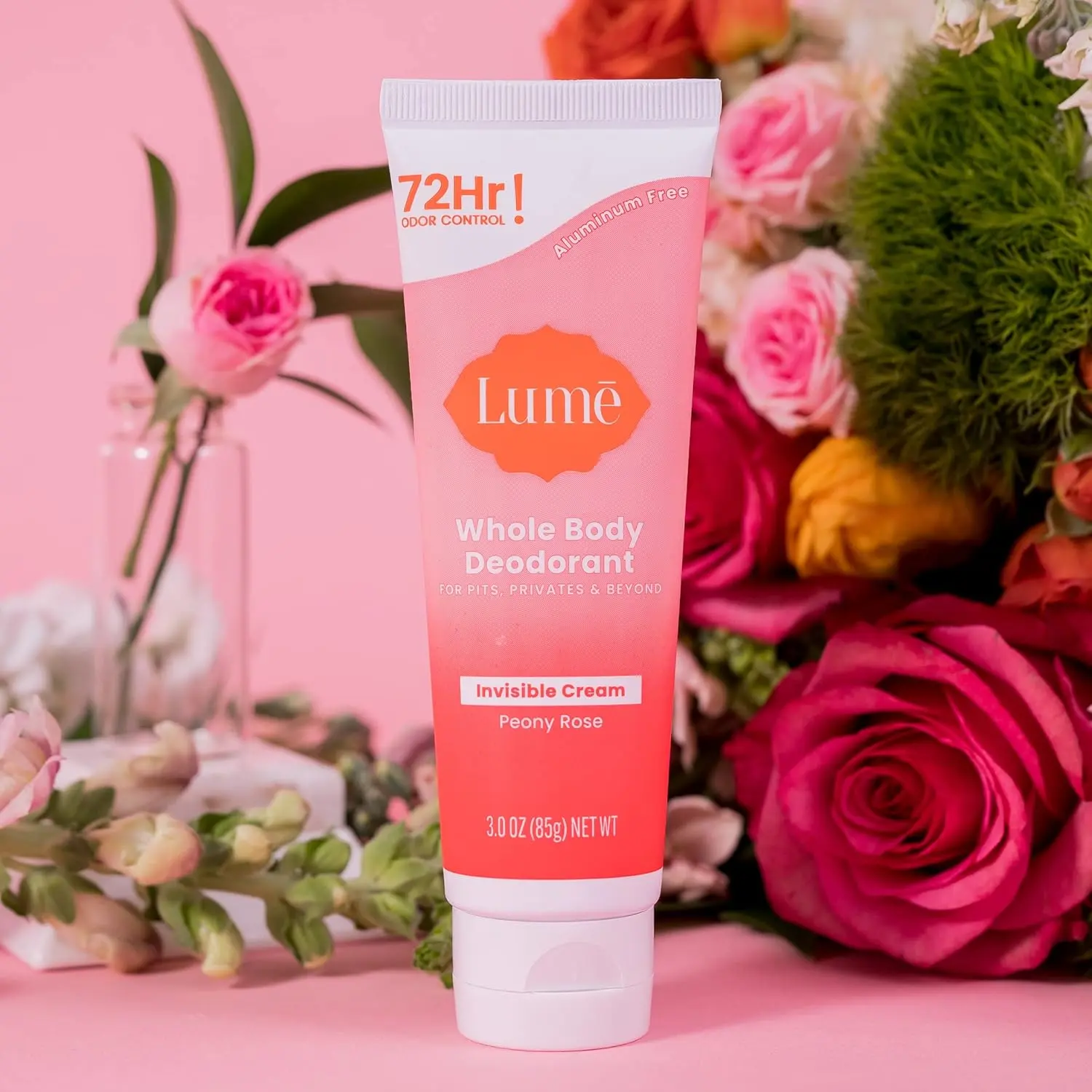 SMELL BETTER EVERYWHERE: Odor control for pits, privates, and morethink feet, underboob, and other areas prone to odor.HIGHLY EFFECTIVE: Lume is clinically proven to block body odor all day, providing 72 hours of protection.SCIENCE-BACKED: Our pH-optimized formula prevents odor before it starts, unlike traditional deodorants that only mask it.Evens Skin Tone: Clinically proven to exfoliate and reduce hyperpigmentation. Hypoallergenic and baking soda free for sensitive skin.PEONY ROSE: A light, romantic scent of delicate blossoms and citrus bergamot. Our Invisible Cream applies smoothlyjust use a pea-sized amount for any area.