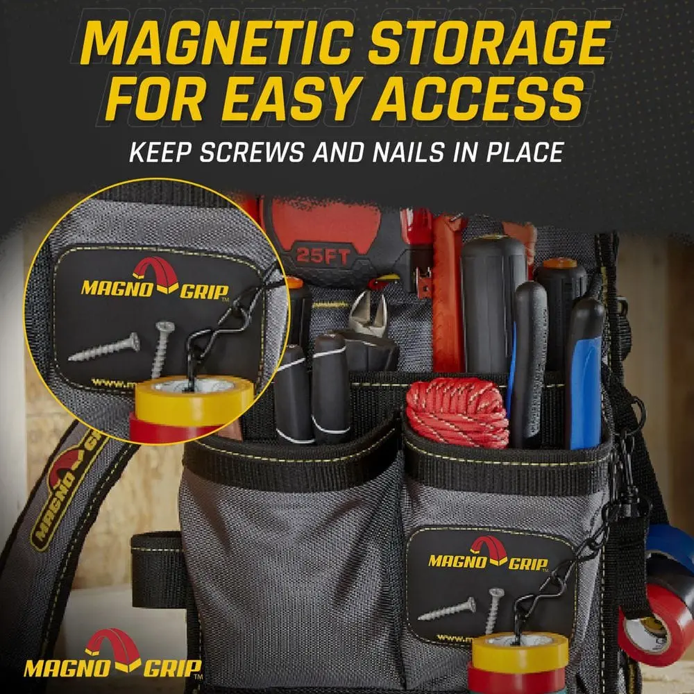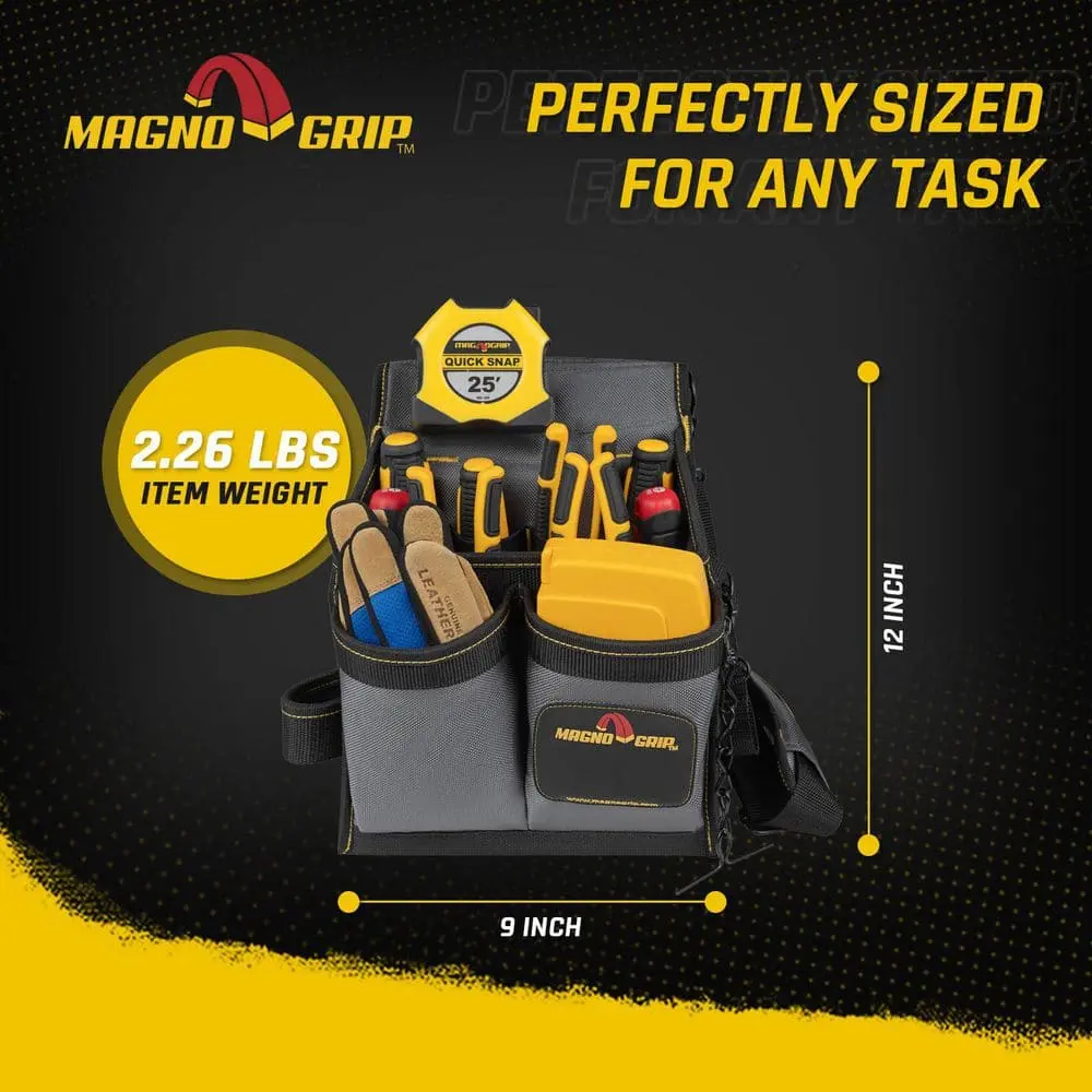 The MagnoGrip 20-Pocket Electricians Pouch with Padded Shoulder Strap is designed for convenience and comfort, featuring 20 pockets to offer extensive storage for all your tools and accessories. The padded shoulder strap ensures extra comfort and helps reduce strain during use, making it ideal for long hours on the job. Built from heavy-duty materials, this pouch is made to last in tough working conditions. The organized design keeps your tools easily accessible and well-organized, while the belt-compatible feature allows it to attach securely to most standard tool belts