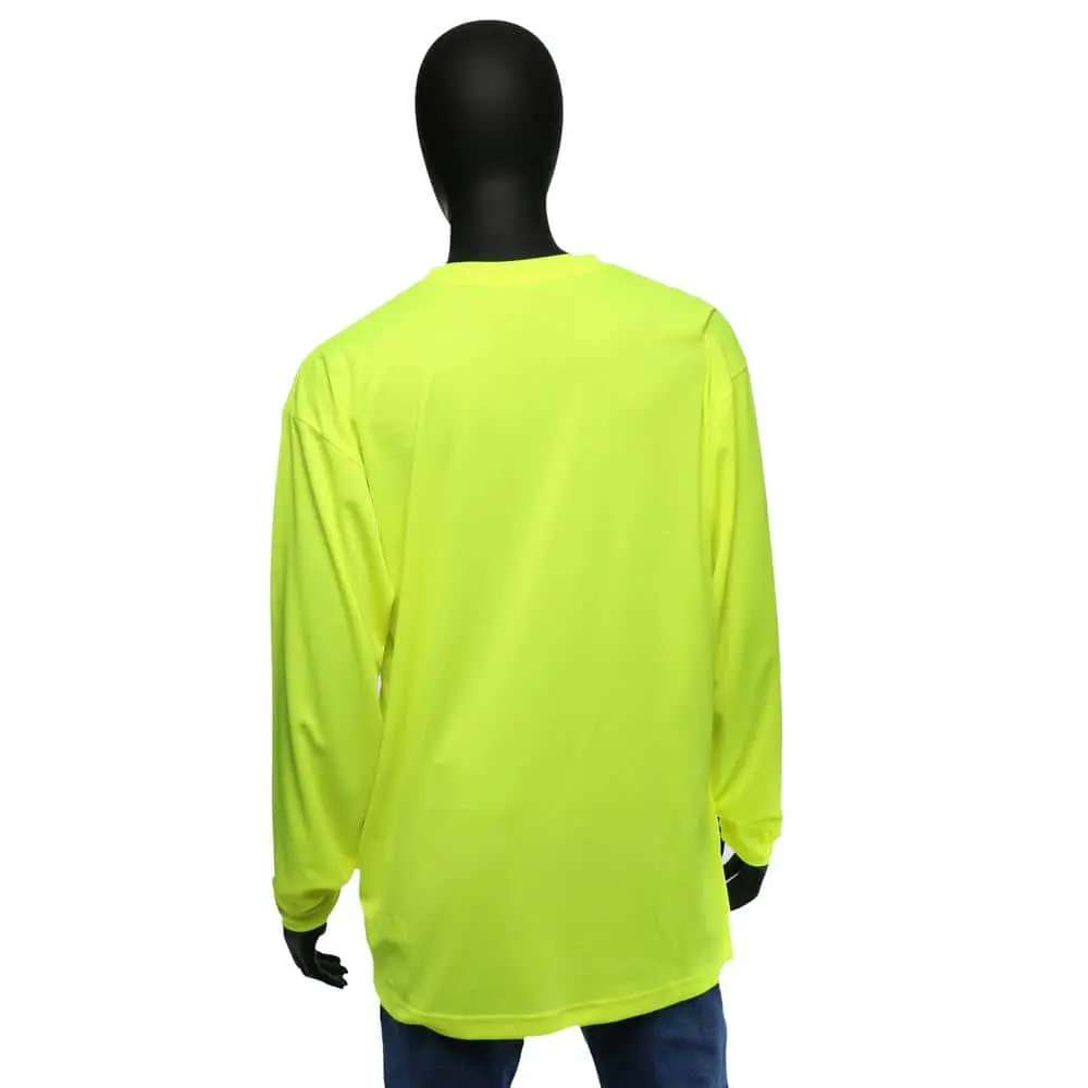 Stay visible and comfortable with this high-visibility long-sleeve shirt. Featuring long sleeves for improved visibility, this shirt is made from performance-wicking material to keep you cool during work. The wider neck opening enhances comfort and breathability, while the exterior chest pocket provides convenient storage for small items. This shirt is perfect for work areas that require high-visibility but do not mandate ANSI protection.