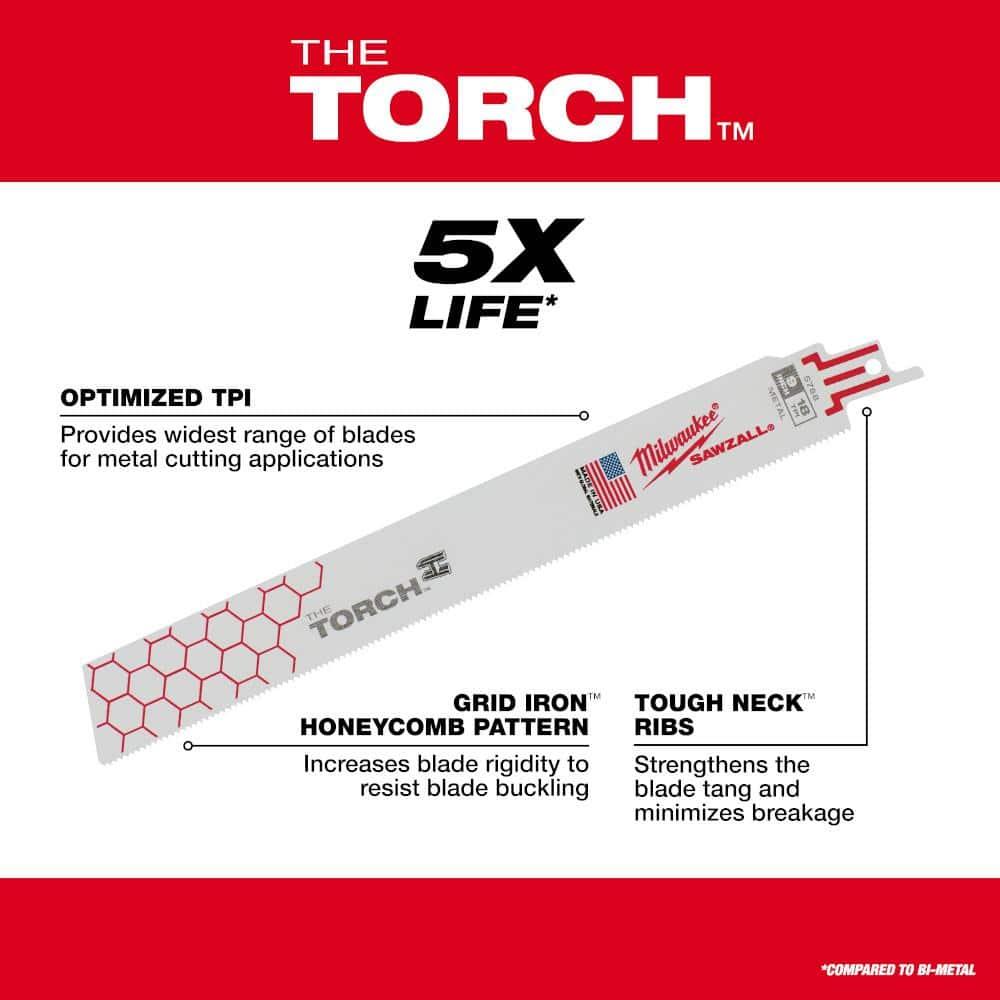 The Milwaukee 48-00-3788 9 in. x 18 TPI Torch Metal-Cutting Blades with Double Duty Upgrade offer maximum durability and extended life with an optimized tooth form. Tough Neck design prevents tang breakage, providing the strongest SAWZALL blade tang. The Grid Iron honeycomb pattern enhances rigidity, making these blades the stiffest for metal cutting. Ideal for tough, straight cuts.