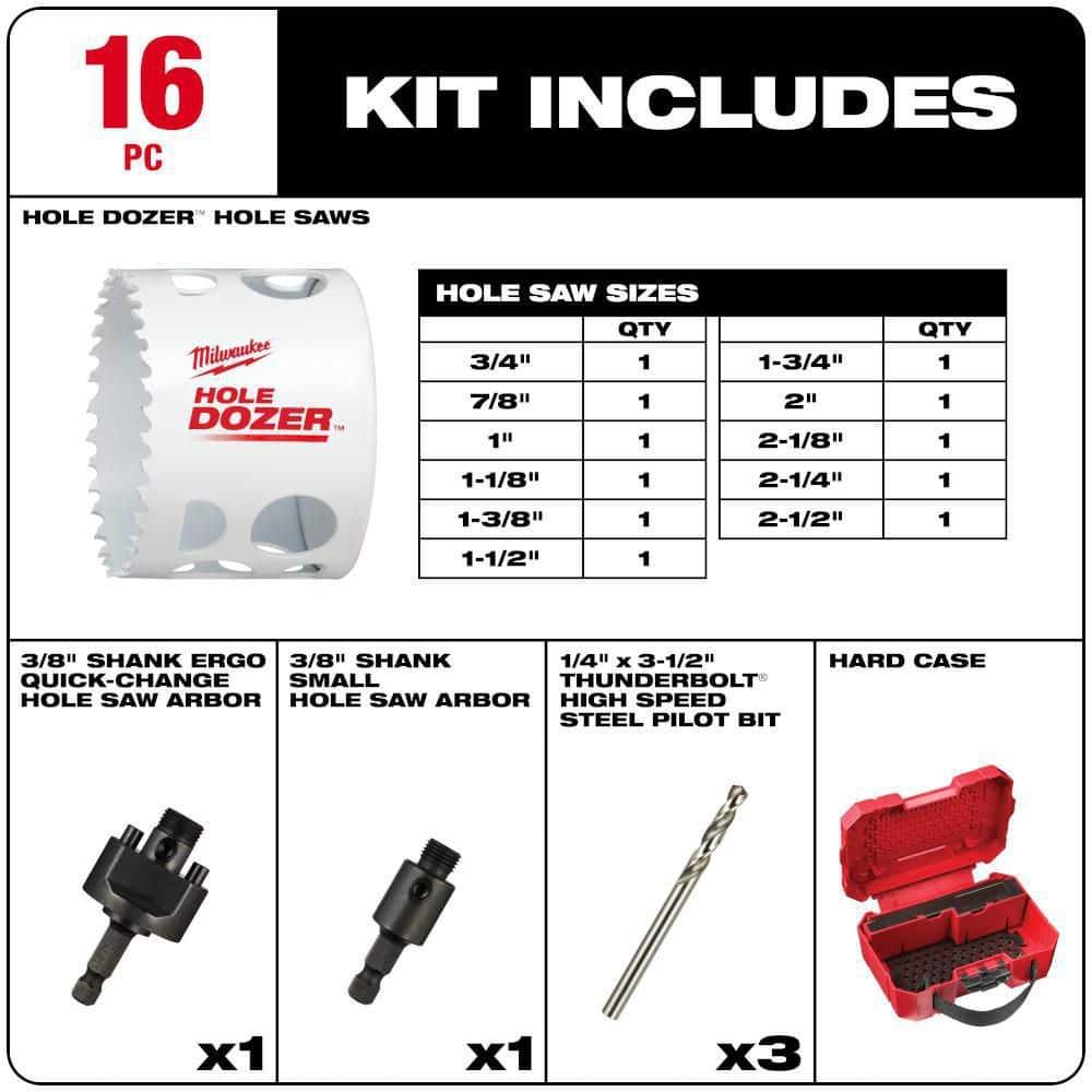 About This Product: The MILWAUKEE General Purpose 16-Piece HOLE DOZER Bi-Metal Hole Saw Kit features a 3.5 TPI tooth design for the longest life in metal applications. These hole saws come with a Lifetime Tooth Break Warranty and are ideal for general-purpose use, making them highly durable. Key Features: All-Access Slots: Easy plug removal, increased pilot visibility, and faster chip ejection. Thermoset Coating: Faster cutting, optimized for cordless tools, providing 25% more holes per charge. Customizable Case: Interchangeable pegs and a removable accessory box for flexible storage. Durable Design: Reinforced grid and heavy-duty latches for secure storage. Made in USA: Proudly manufactured in the USA. Packout Compatible: Fits conveniently in Milwaukee Packout Organizers for easy transport and storage