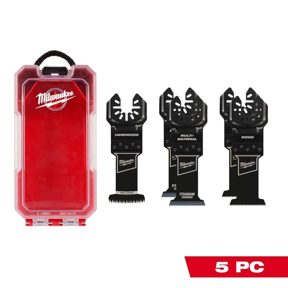 The MILWAUKEE OPEN-LOK Multi-Tool Blade Variety Kit (5PC) offers a selection of blades for multi-material, hardwood, and clean wood cutting. It includes TITANIUM CHARGED Bi-Metal blades with a titanium blend for up to 15X longer life than high carbon steel. These blades are suitable for cutting wood with nails, PVC, and drywall. The Triple-Ground Japanese Tooth hardwood blade cuts up to 2X faster than previous models and features a PRO-CURVE edge for better control. High carbon steel (HCS) blades with aggressive teeth are designed for fast wood cutting. All blades have a reinforced Universal Fit OPEN-LOK anchor for strength and compatibility with 100+ multi-tools (excluding Starlock). The set comes in a hard case for easy storage. Made in the USA with global materials.