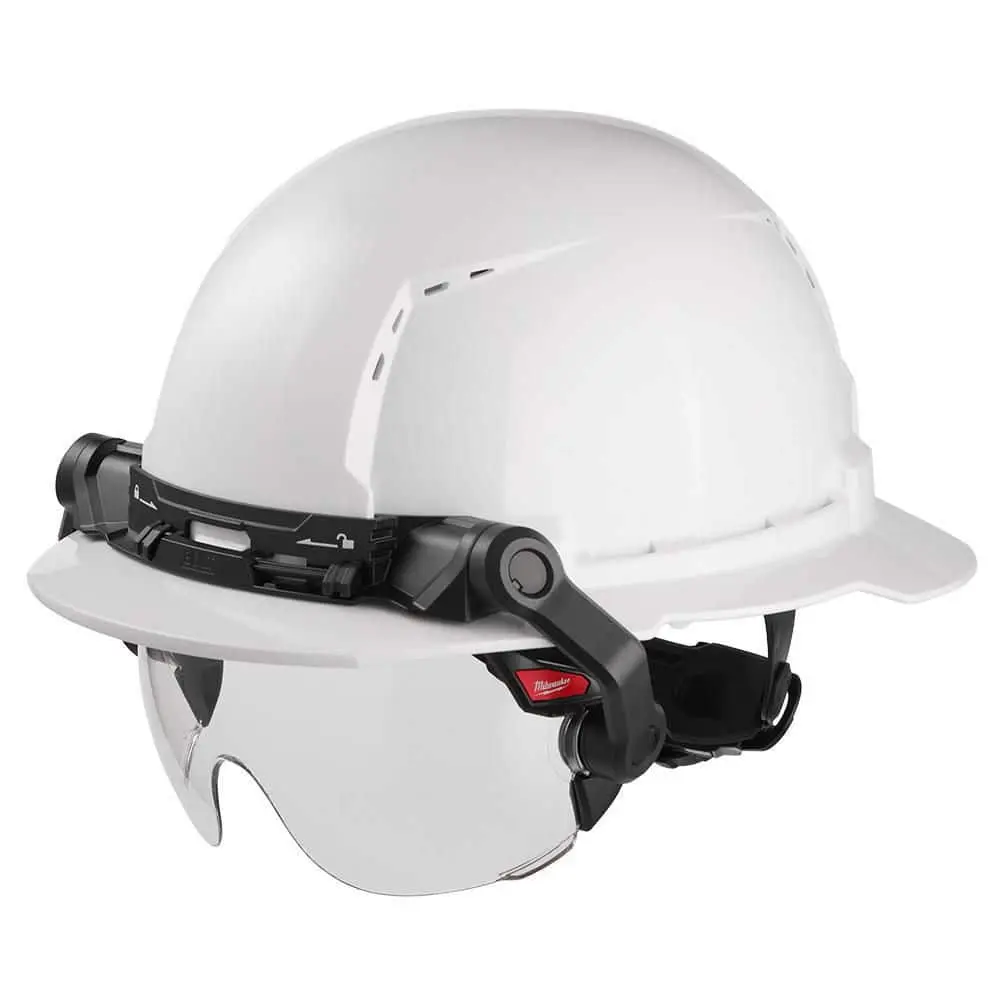 The MILWAUKEE BOLT Eye Visor is engineered for comfort and seamless headlamp compatibility. Rated as Z87.1+ safety spectacles, this eye visor can replace standard safety glasses. Its adjustable pivoting design ensures a secure and comfortable fit for various face shapes. The visor includes a BOLT Low-Profile Headlamp Mount, making it compatible with most headlamps. Each visor features a fog-free interior coating and a durable, anti-scratch exterior coating to extend its lifespan. As part of the BOLT System, it allows for simultaneous accessory attachment, securing easily into the BOLT front mount of MILWAUKEE safety helmets and hard hats.