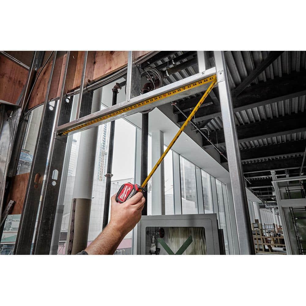 Introducing the Milwaukee 25 ft. Compact Magnetic Tape Measure! With a remarkable reach of up to 15 ft. and a magnet that effortlessly attaches to EMT and steel studs, this tape measure is designed for maximum convenience. Its wear and impact-resistant properties, along with nylon blade protection and an anti-tear coating on the first 6 inches of the blade, ensure durability and longevity. Built to withstand rigorous job site conditions, the compact measuring tape is constructed with a 5-point reinforced frame for unparalleled impact resistance. What's more, the double-sided printing with a blueprint scale makes reading and transferring measurements a breeze, ultimately boosting productivity. Don't miss out on this essential tool for professionals!