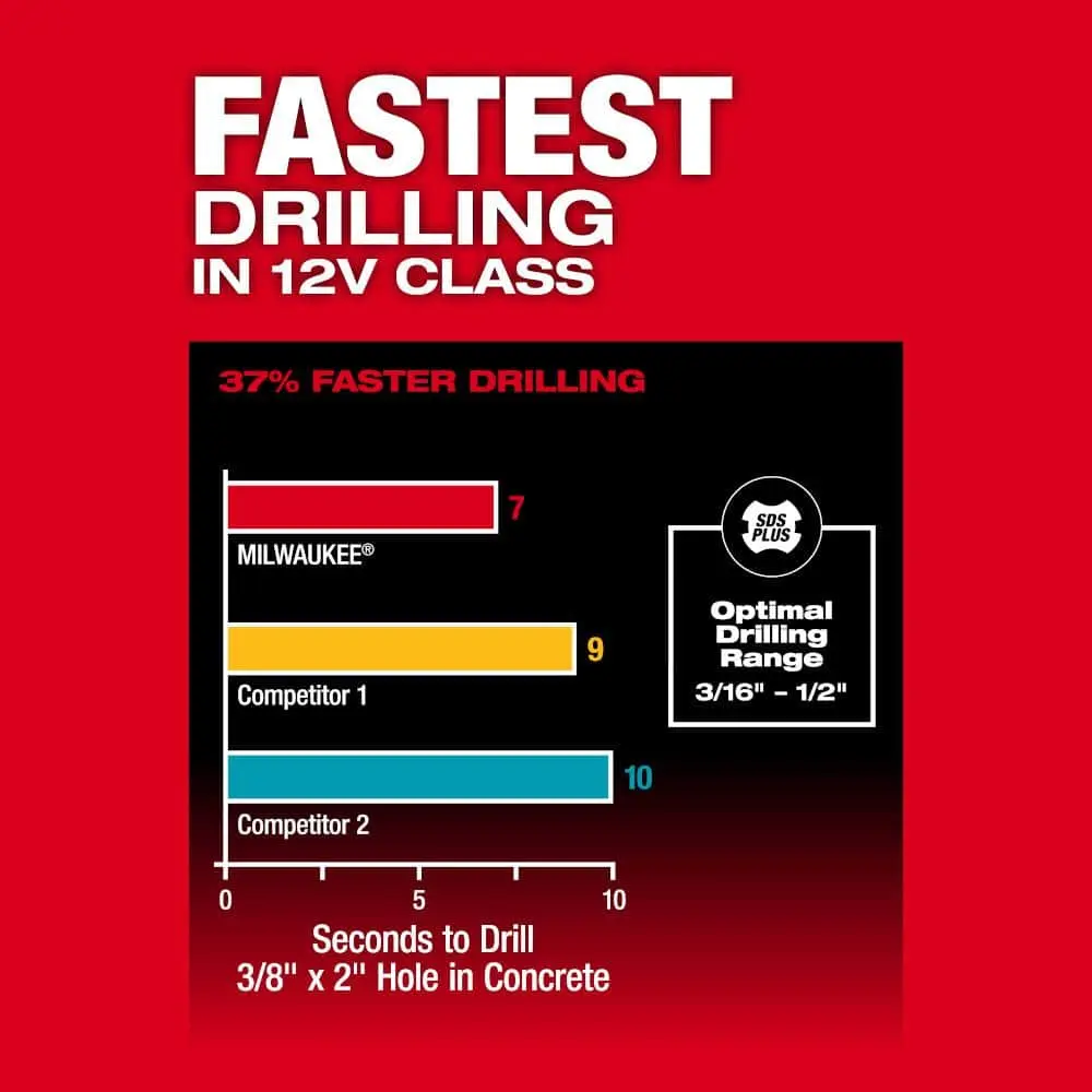 The M12 FUEL 5/8" SDS Plus Rotary Hammer is the next evolution of cordless rotary hammers, designed to maximize jobsite performance and productivity. As the fastest drilling rotary hammer in its class, it features a lightweight, compact, one-handed design ideal for tight spaces and overhead work. With the M12 REDLITHIUM XC 4.0 Battery, it can drill up to 60 holes (1/4 in. x 2 in.) per charge. Powered by a POWERSTATE Brushless Motor, it delivers 0.89 ft-lbs of impact energy, 1,214 RPM, and 4,414 BPM, providing the speed and power required for demanding applications. The 3-mode operation—rotary hammer, chisel, and rotation only—ensures maximum versatility, while the AVS Anti-Vibration System reduces fatigue and enhances comfort during extended use.