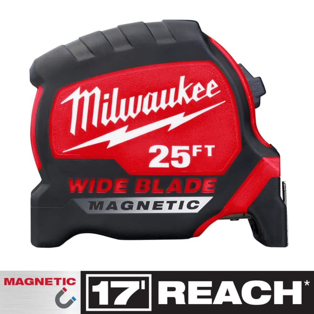 Introducing the Milwaukee 25 ft. Wide Blade Magnetic Tape Measure, designed to provide the longest reach and straightest standout in the industry. With an impressive 17 ft. of reach, this tape measure empowers users to take precise measurements independently. The innovative Milwaukee blade design minimizes blade arc, ensuring efficient and accurate measuring. Equipped with a magnetic hook for easy attachment to EMT and steel studs, this tape measure is tough and impact-resistant. Featuring nylon bond blade protection and an anti-tear coating on the first 6 ft. of the blade, it is built to last. Constructed with a 5-point reinforced frame for superior impact resistance, this measuring tape is your reliable companion on the jobsite.