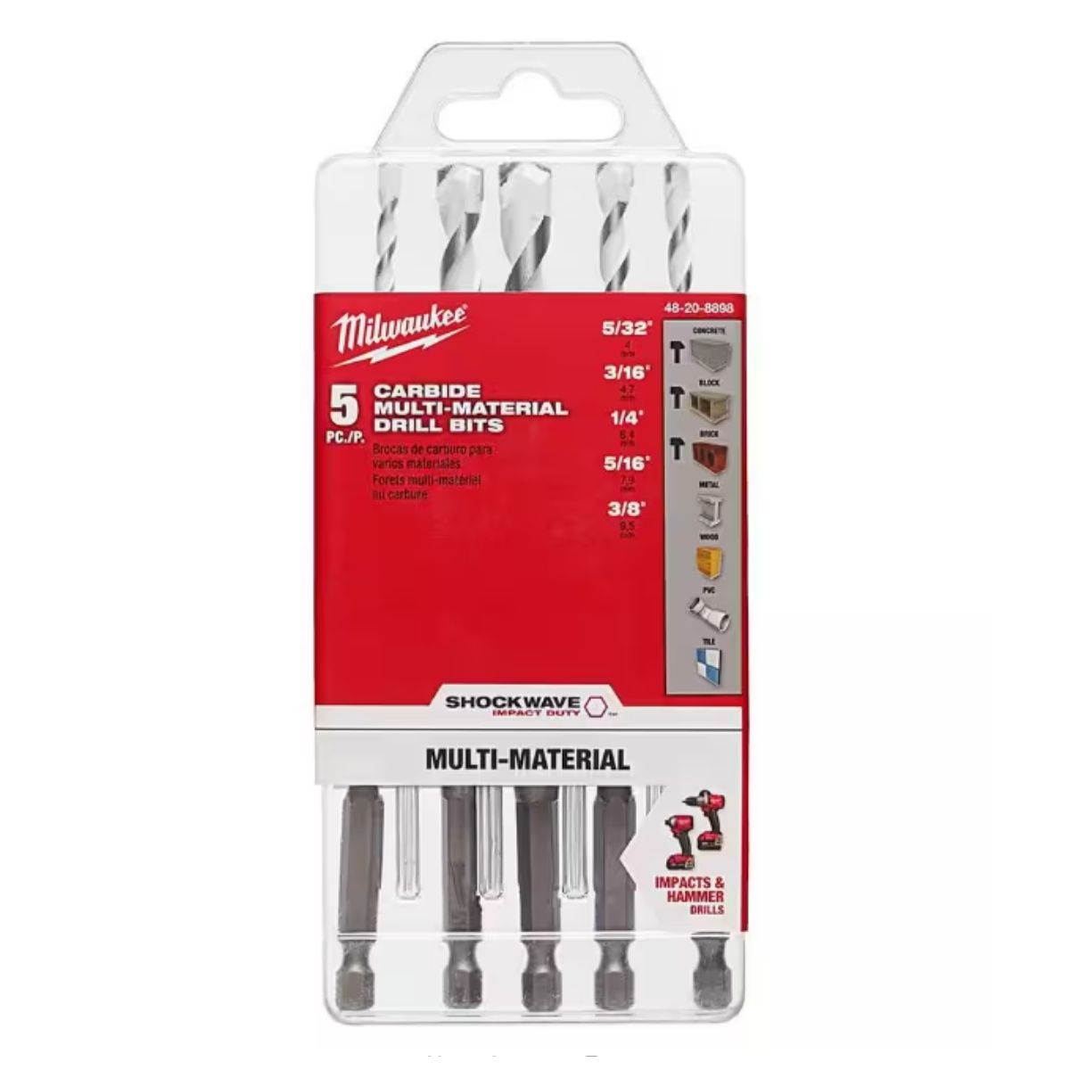 The MILWAUKEE 5-Piece SHOCKWAVE Impact Duty Carbide Multi-Material Drill Bits offer exceptional versatility, capable of handling a wide range of materials such as brick, block, concrete, steel, aluminum, ceramic tile, backerboard, wood, PVC, and drywall.
