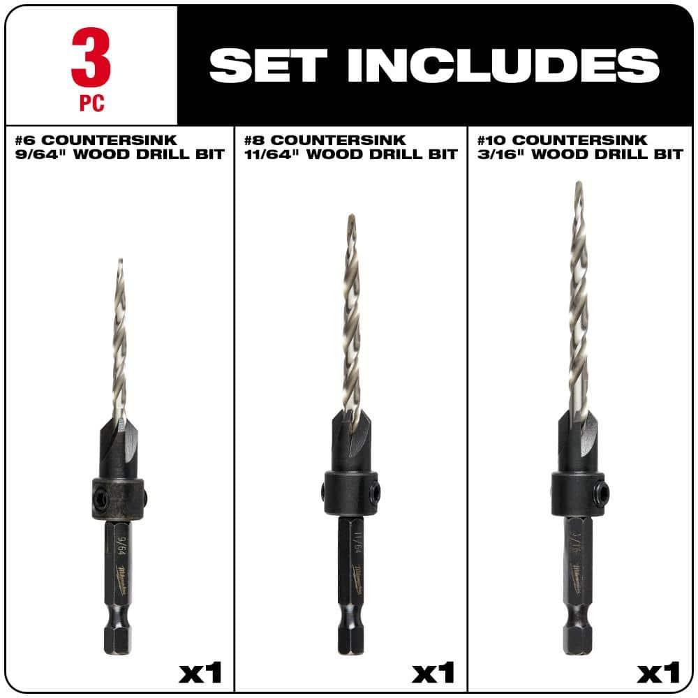 About This ProductThe MILWAUKEE SHOCKWAVE 3-PC Countersink Bit Set includes #6, #8, and #10 countersinks. Designed for use with Milwaukee Drill Drivers, it features 1/4" Quick Change Hex Shanks for fast size changes and an adjustable 1/8" Hex for precise depth control.