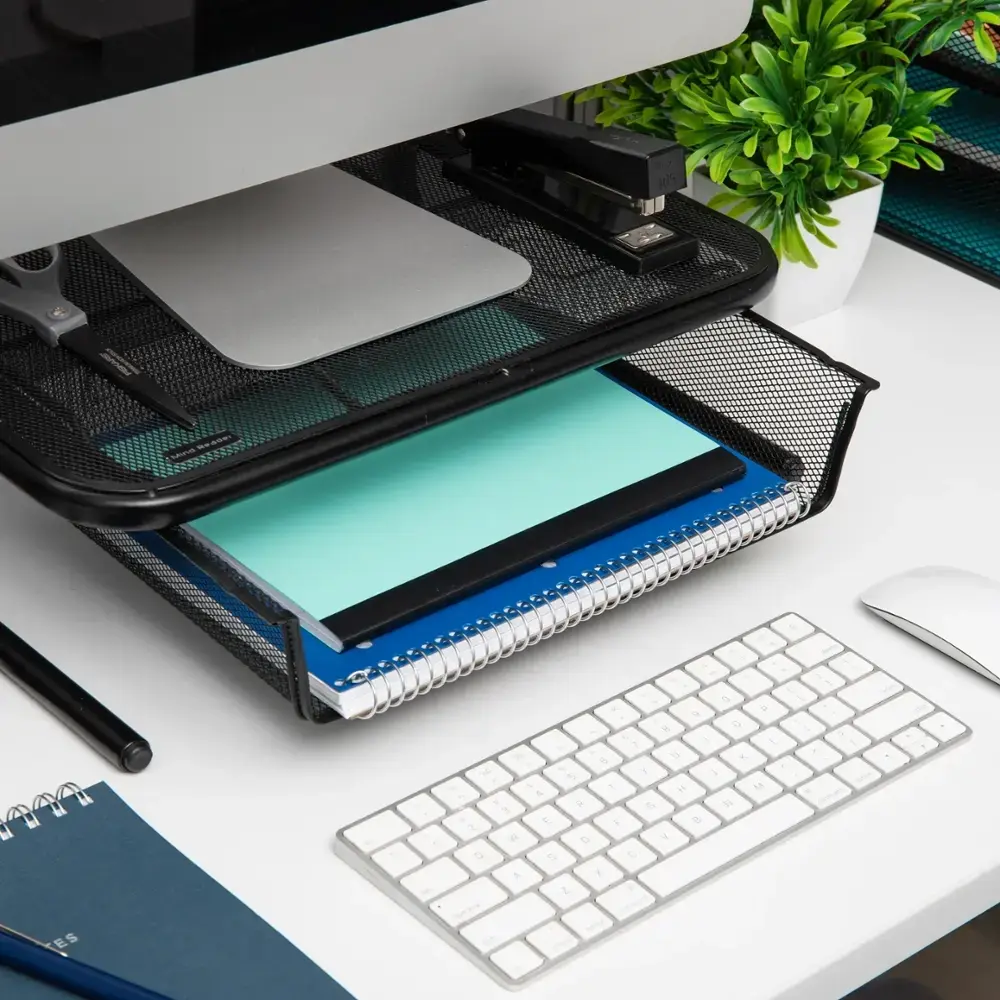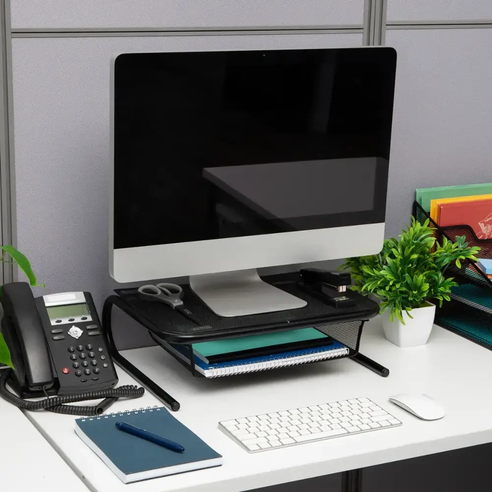 The Mind Reader Monitor Stand offers an ergonomic design that raises your monitor or laptop to a comfortable viewing height, reducing neck and eye strain. Its ventilated metal mesh surface ensures optimal airflow to prevent overheating, while the spacious 16.75"L x 13"W x 5.25"H surface accommodates most monitors and laptops. With a durable build and sleek black finish, it adds a modern touch to your workspace. Additionally, the desktop organizer feature provides convenient storage space underneath for papers, files, or office supplies, enhancing productivity and maintaining a clutter-free environment.