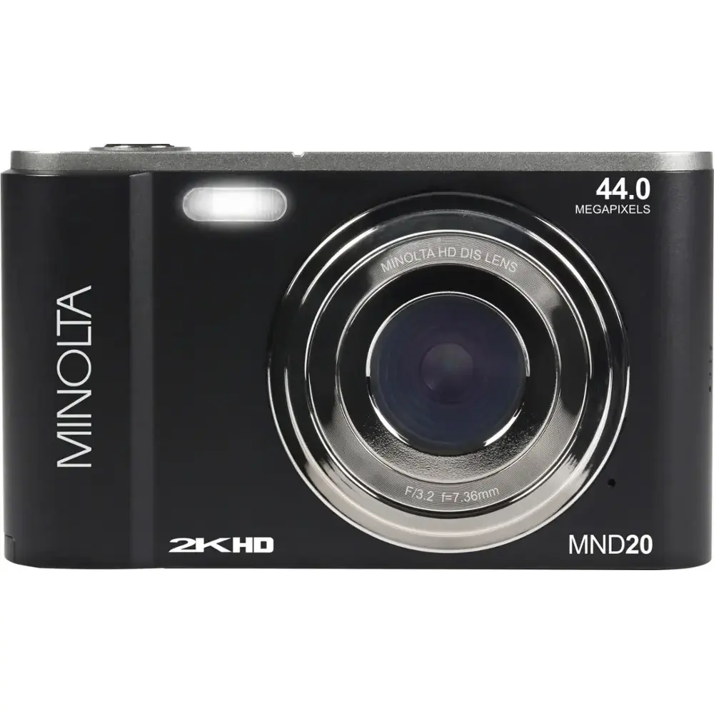 The Minolta MND20 is a compact and versatile camera that delivers high-resolution images and ultra-clear 2.7K QHD video, all in a sleek, portable design. Its crystal-clear lens and 16x digital zoom make it perfect for a wide range of shooting scenarios. With a powerful sensor, the MND20 captures 44-megapixel still images and 2.7K Quad HD video. The 2.9" 230k-dot LCD screen and built-in LED lighting make it easy to review and compose your shots. The camera features a single SD card slot preloaded with a 32GB memory card, and it supports SD cards up to 128GB. Intelligent scene modes help optimize your shots, while anti-shake digital image stabilization reduces motion blur in fast-moving or low-light conditions.