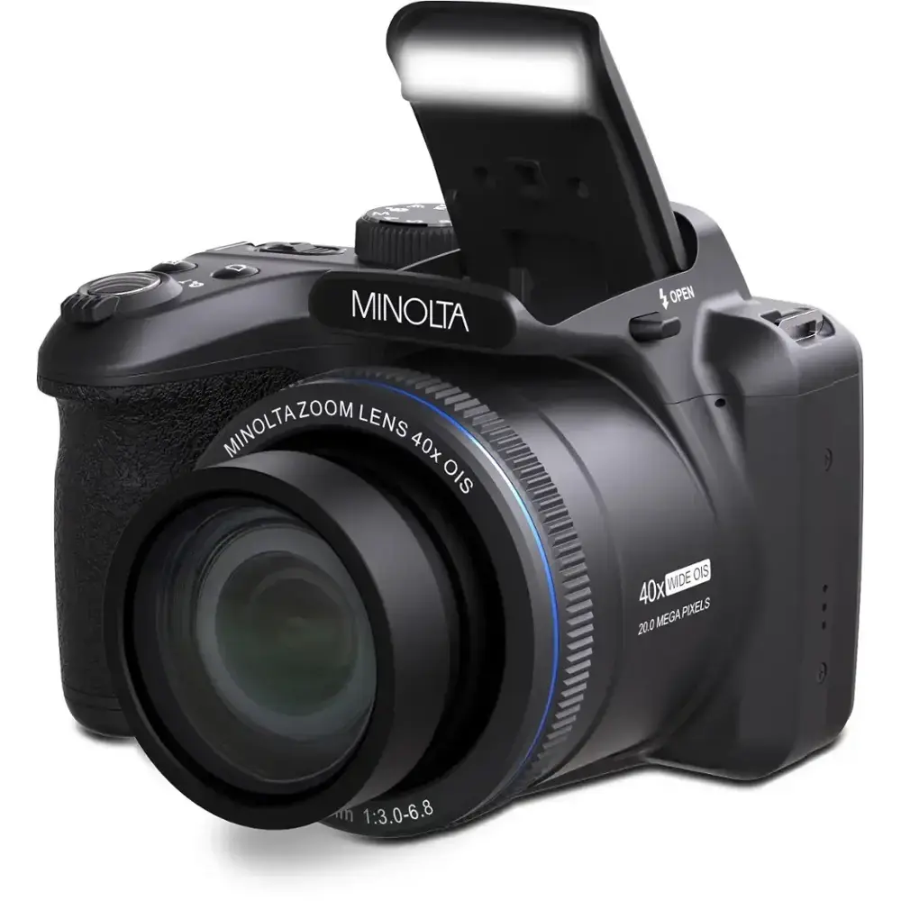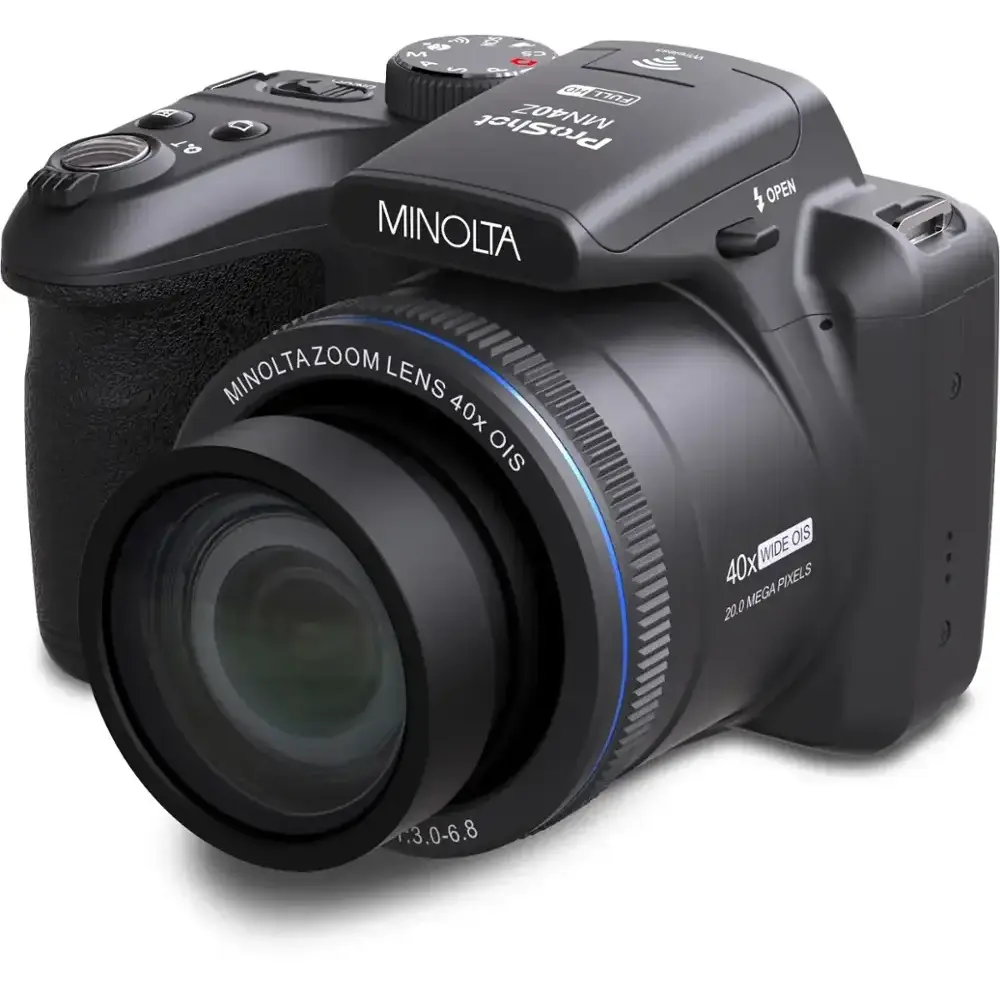The Minolta ProShot MN40Z is a compact yet powerful bridge camera designed for versatility. Featuring a 40x optical zoom, it covers a 24-960mm equivalent focal range, making it perfect for capturing subjects both near and far. Its 20.68MP BSI CMOS sensor ensures high-resolution still images and 1080P FHD video recording, delivering vibrant detail even in low-light conditions with an ISO range of 100-3200.