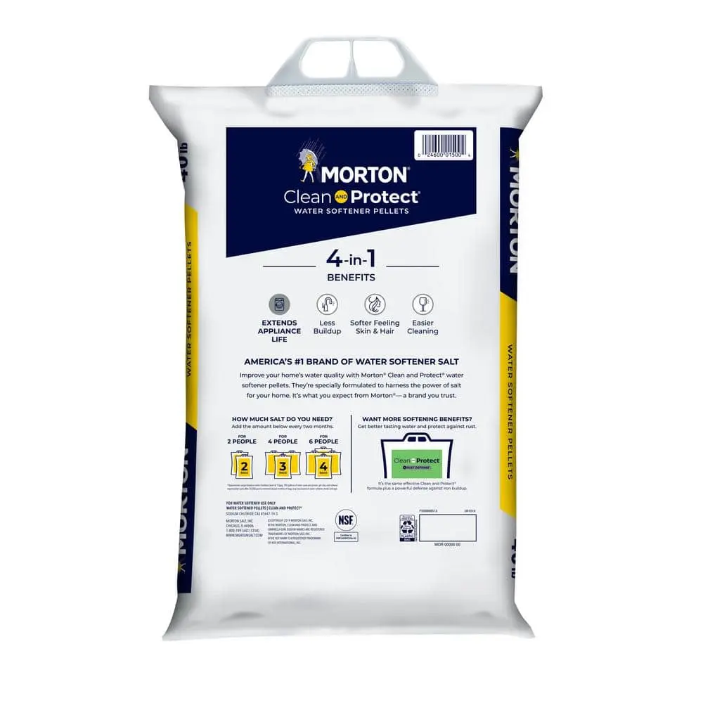 Morton Clean and Protect Water Softener Salt is specifically designed to reduce buildup in pipes and appliances, enhancing their longevity and improving efficiency. Perfect for households with hard water, this solution provides softer water with multiple benefits. By using Morton Water Softener Salt Pellets, you'll notice a reduction in hard water deposits in pipes and appliances, making dishes easier to clean and leaving your hair and skin feeling softer after washing. For continued benefits, it’s recommended to add 2 to 4 bags every two months based on household size. The 40 lbs. bags feature a sturdy handle and easy-tear opening for convenient carrying and pouring.