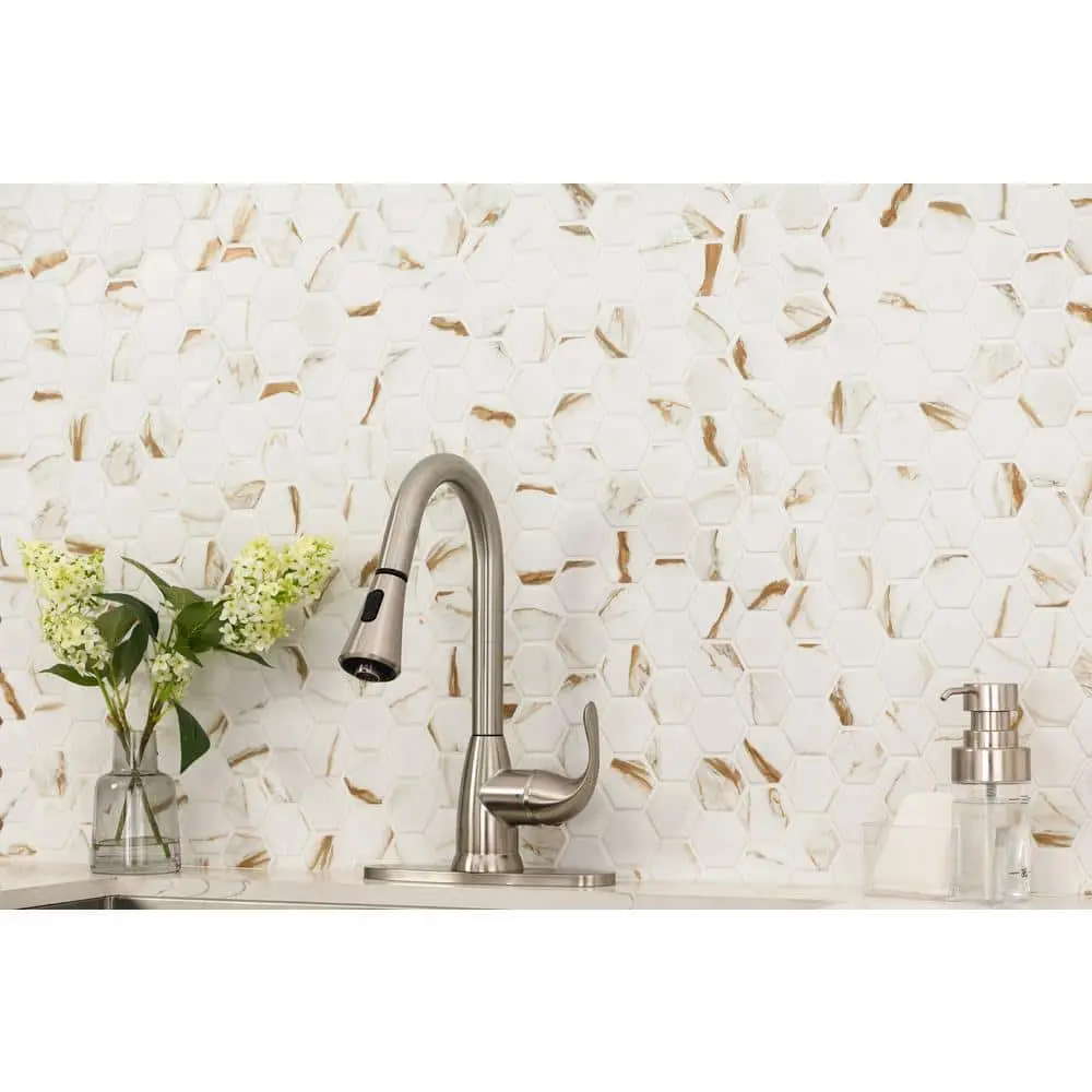 The MSI Calacatta Gold Hexagon 12 in. x 13 in. Matte Porcelain Mosaic Tile features a durable matte porcelain construction, offering both style and longevity. Each tile measures 12 in. x 13 in., covering 0.99 sq. ft. per piece, making it a versatile option for various spaces. Designed with an elegant Calacatta Gold marble-inspired hexagon pattern, it adds a sophisticated touch to any room. Ideal for both floor and wall installations, this tile is water-resistant, stain-resistant, and easy to maintain, ensuring long-lasting beauty. The matte surface enhances its modern appeal, making it a perfect choice for contemporary interiors