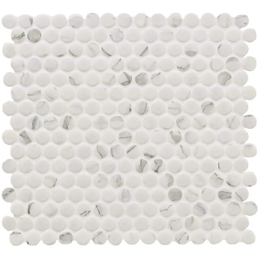 The MSI Penny Round Carrara White 11.3 in. x 12.2 in. Matte Porcelain Mesh-Mounted Mosaic Tile offers a timeless, elegant look with its Carrara white penny round design. The matte porcelain finish adds sophistication to any space, while the mesh-mounted design makes installation and cutting simple and efficient. This tile is ideal for creating stunning backsplashes, accent walls, and shower areas. Durable, easy to maintain, and suitable for both residential and commercial use, it provides both style and functionality for any design project.