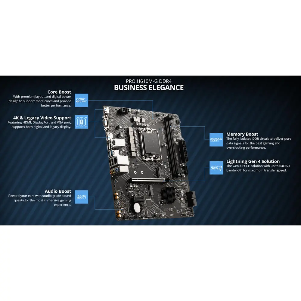 The MSI PRO H610M-G DDR4 is a budget-friendly micro-ATX motherboard designed for 12th generation Intel Core processors. It offers a great balance of performance and features, making it an excellent choice for a wide range of PC builds, from gaming rigs to productivity workstations.
