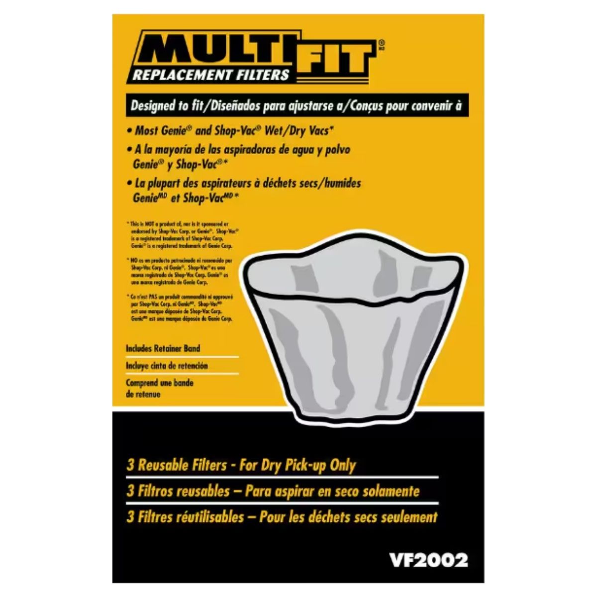 Get ready for cleaning with a 3-pack of MULTI FIT Disposable Filter Bags for Shop-Vac wet/dry vacs. Use with the MULTI FIT Foam Sleeve for best results. Designed for dry pickup, remove filter disc for wet messes.Fits most 5 Gal. and larger shop-vac wet dry vacuumsFor dry pick up of general household debrisIncludes 3 disc filters and retaining band for security