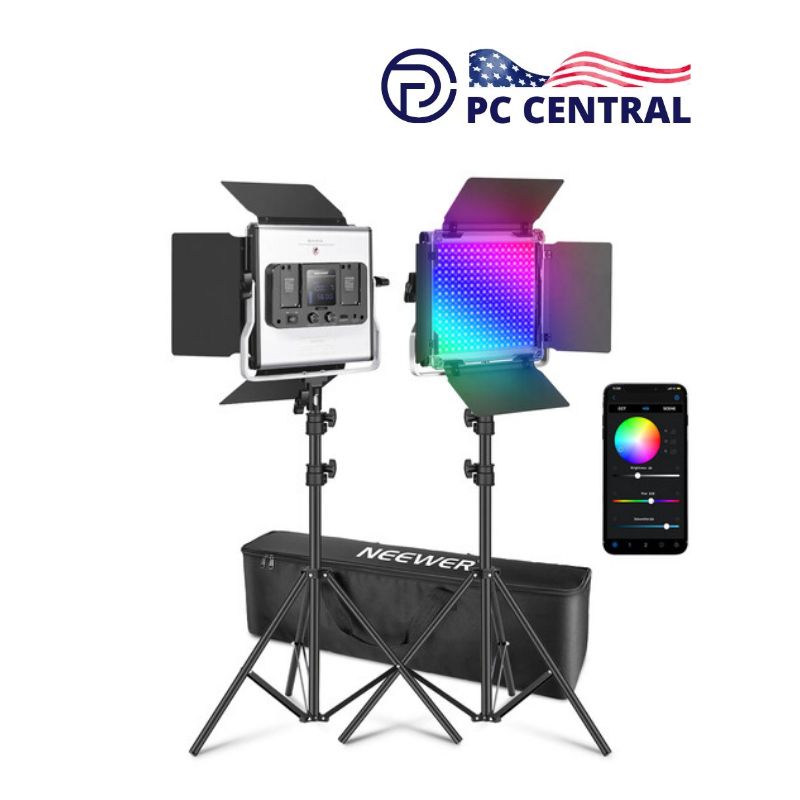 The Neewer Upgraded RGB 660 PRO II LED Video Light Kit 2-pack contains two RGB 660 PRO II LED Video Lights, each with a 78.7" light stand, AC adapter, and 4-way barndoors. It all fits in the included carry bag. Each light has a variable CCT color range from 3200 to 5600K with an accurate CRI rating of 97+. The lights also have an RGB mode that gives the shooter access to literally millions of custom colors.