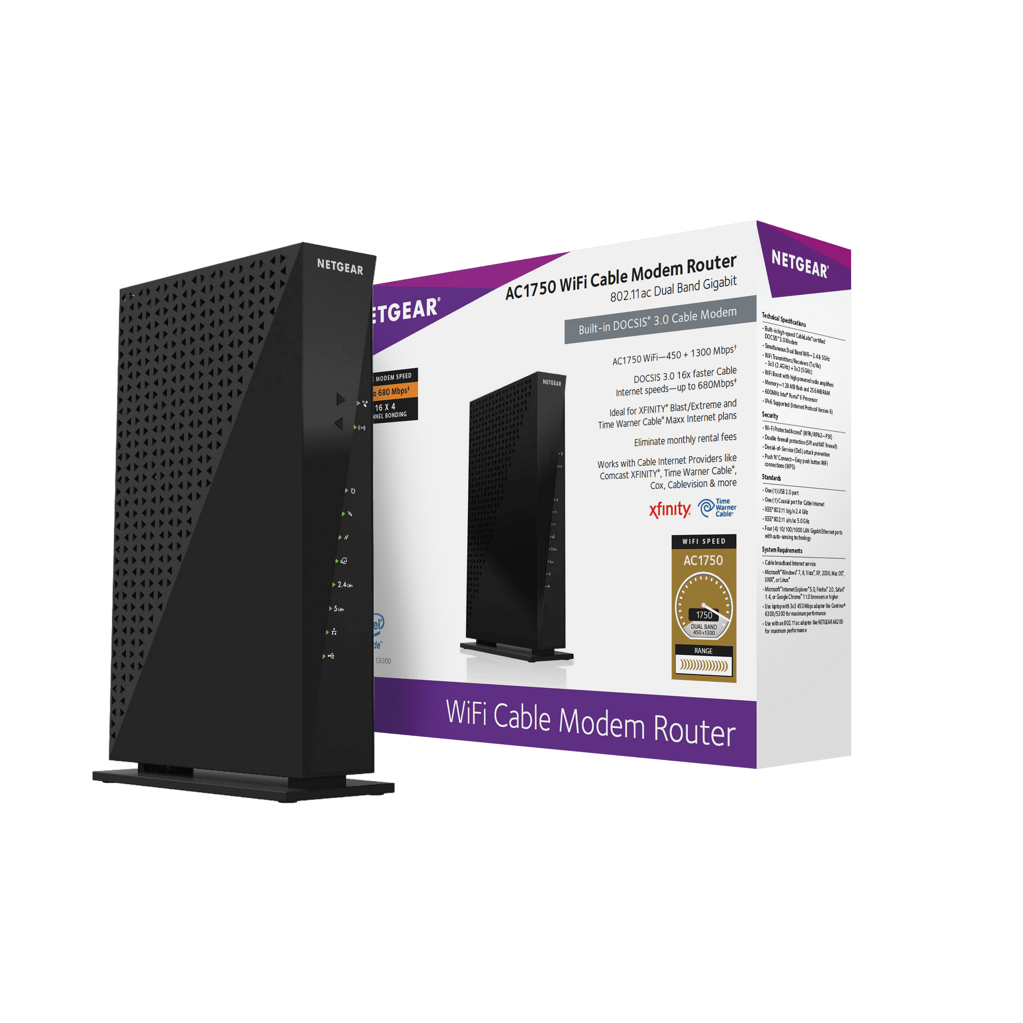 The NETGEAR AC1750 WiFi Cable Modem Router (C6300) offers top-tier performance with its integrated AC1750 WiFi router and DOCSIS 3.0 cable modem, delivering WiFi speeds of up to 1750Mbps. Designed to enhance your streaming experience, it ensures smooth HD video streaming, faster downloads, and seamless online gaming. It is certified for use with Xfinity by Comcast, Spectrum, Cox, Cablevision, and other major providers.