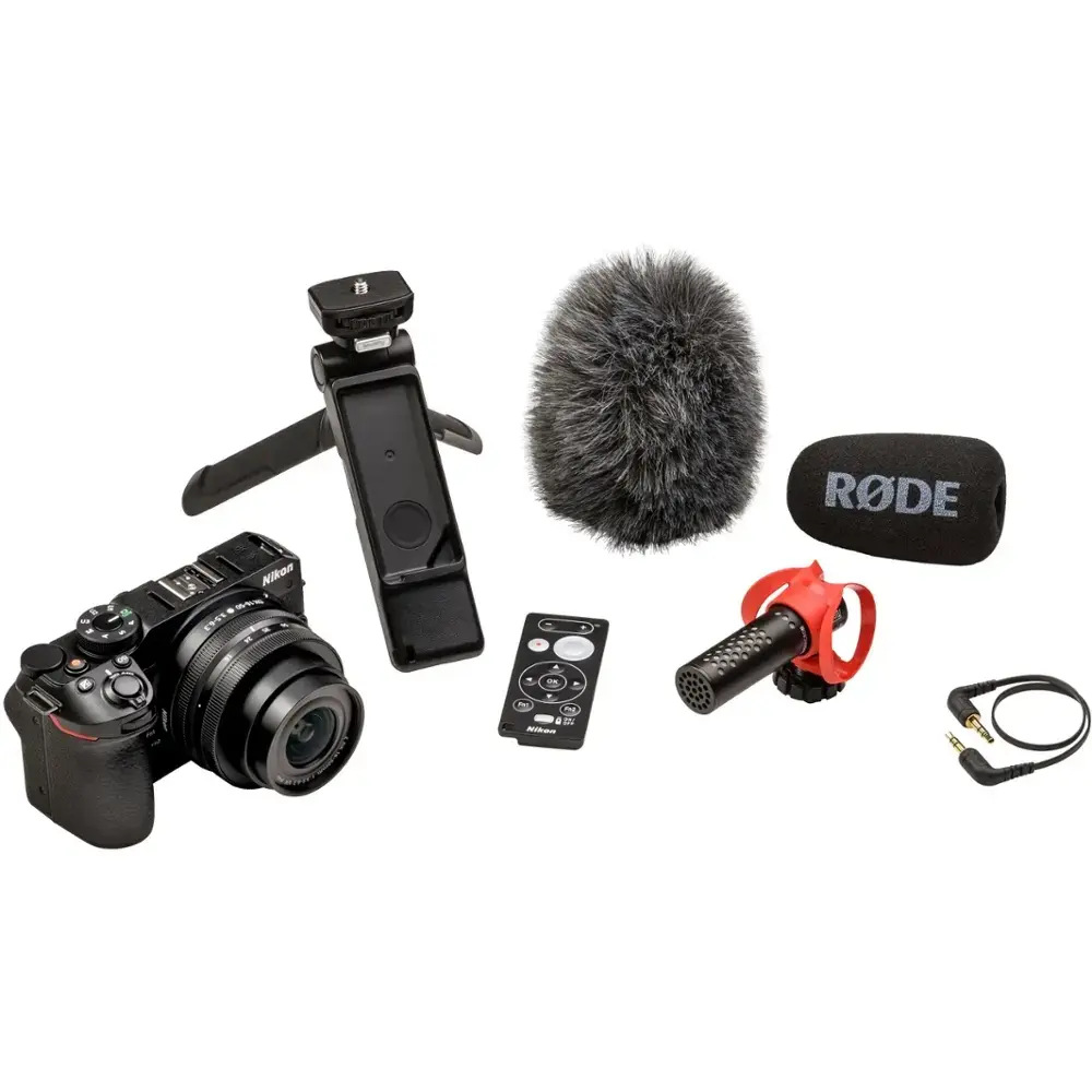 The Z 30 Creator's Kit includes the compact and lightweight Z 30 camera, paired with the NIKKOR Z DX 16-50mm f/3.5-6.3 VR lens. This versatile zoom lens features built-in Vibration Reduction for stabilized images and quiet operation, making it ideal for video. The kit also comes with the Nikon ML-L7 Bluetooth Remote Control, a RODE VideoMicro Microphone II, and a SmallRig Tripod Grip designed to hold the ML-L7.