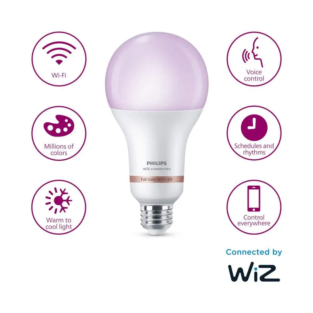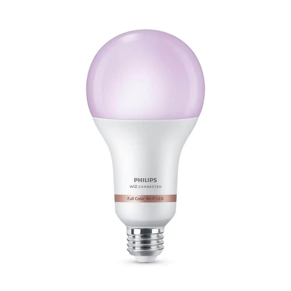 Effortlessly upgrade your home lighting with smart Wi-Fi-enabled LED bulbs designed for convenience and comfort. With a brilliant 2550-lumen output, this bulb delivers vibrant colors and customizable white light to create the perfect ambiance for any space. Simply screw in the bulb, download the free WiZ app, and follow the setup instructions. Control your lights via the app, voice commands, or pre-set scenes to match your mood or daily activities.