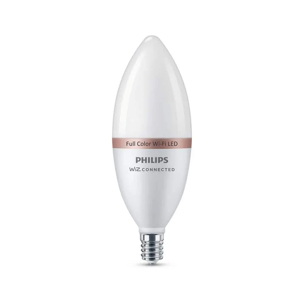 Philips Smart Wi-Fi LED lighting gives you full control over your home’s lighting with smart bulbs that are both easy to use and affordable. Simply connect them to your existing Wi-Fi network for enhanced functionality. This Smart Color and Tunable White B12 bulb with a narrow E12 socket is perfect for decorative applications like chandeliers or wall sconces. Experience vibrant color modes that transform any room or use tunable white light that adjusts from warm white to cool daylight. With the app presets, you can easily set the perfect lighting for different activities. Choose from millions of colors, thousands of white shades, and pre-set well-being modes to find your ideal light temperature. Control your lights remotely through the WiZ app or compatible voice assistants. A Wi-Fi connection is required for wireless operation. Philips Wi-Fi lighting is powered by WiZ, and all controls are managed through the WiZ app.