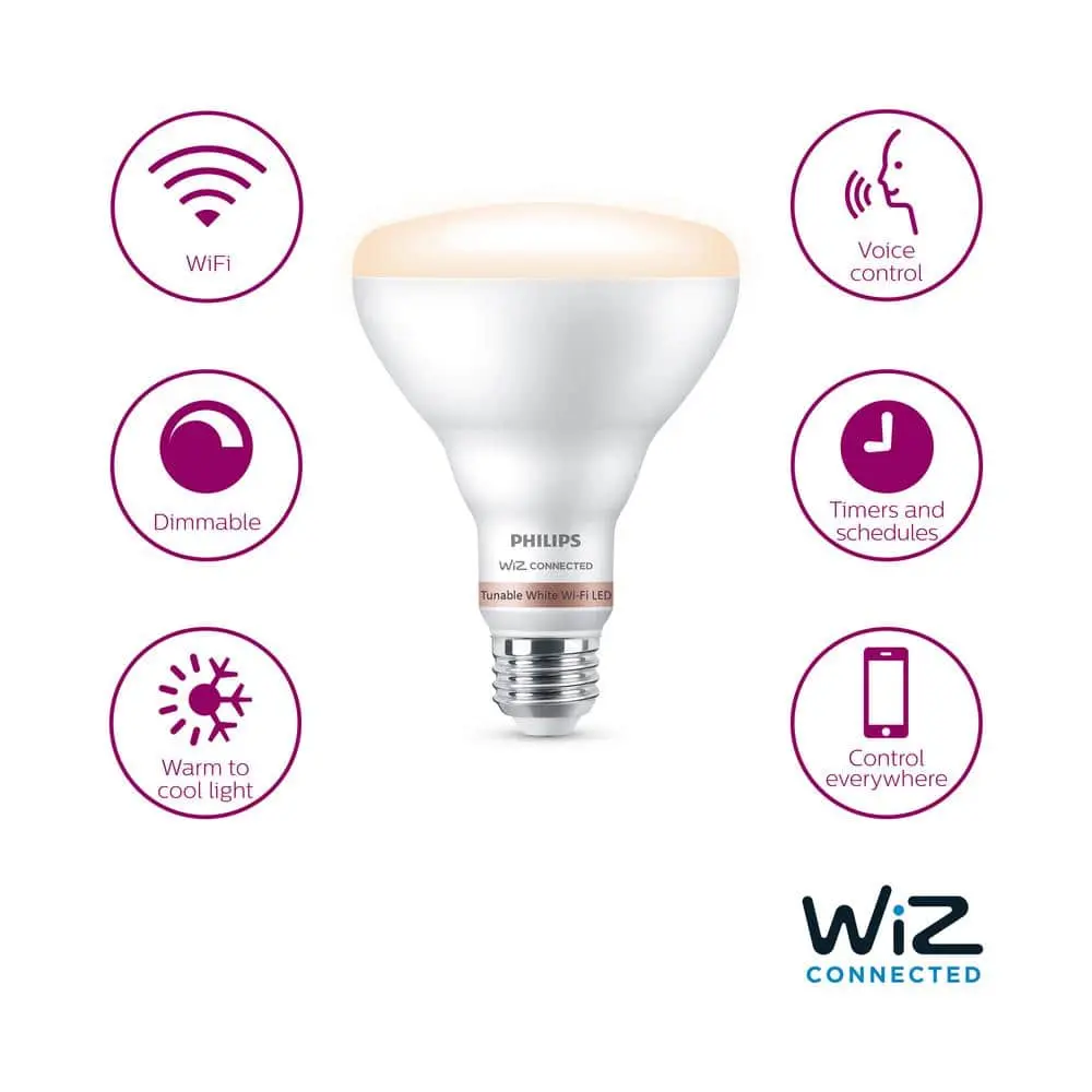 Philips Smart Wi-Fi LED lighting offers you full control over your lighting with smart bulbs that are easy to use, functional, and budget-friendly. Simply connect these high-quality Philips bulbs to your existing Wi-Fi network to enjoy smarter lighting. With smart tunable white light, you can adjust the lighting from a relaxing warm white to an energizing cool daylight. Use app presets to find the perfect lighting for your daily activities. Control your lights from anywhere using the WiZ app or your preferred compatible voice assistant. Enjoy thousands of shades of white and preset well-being modes to set the ideal light temperature. This product requires a Wi-Fi connection for wireless operation and is compatible with WiZ apps and products, as well as Google Assistant, Amazon Alexa, and Siri Shortcuts.