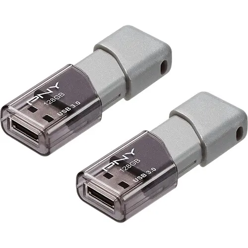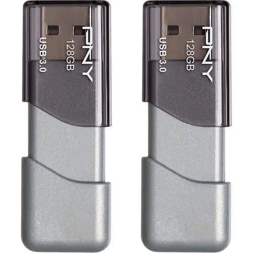 Easily transfer and store data with the 128GB Turbo Attaché 3 USB 3.0 Flash Drive (2-Pack) in Gray from PNY Technologies. Featuring a 128GB capacity, it utilizes a USB-A 3.2 Gen 1 (USB 3.1 Gen 1 / USB 3.0) interface for fast data transfers with read speeds up to 100 MB/s. The sliding collar cap protects the USB connector when not in use, while its slim, portable design makes it easy to carry. This plug-and-play drive is compatible with both Windows and Mac computers.