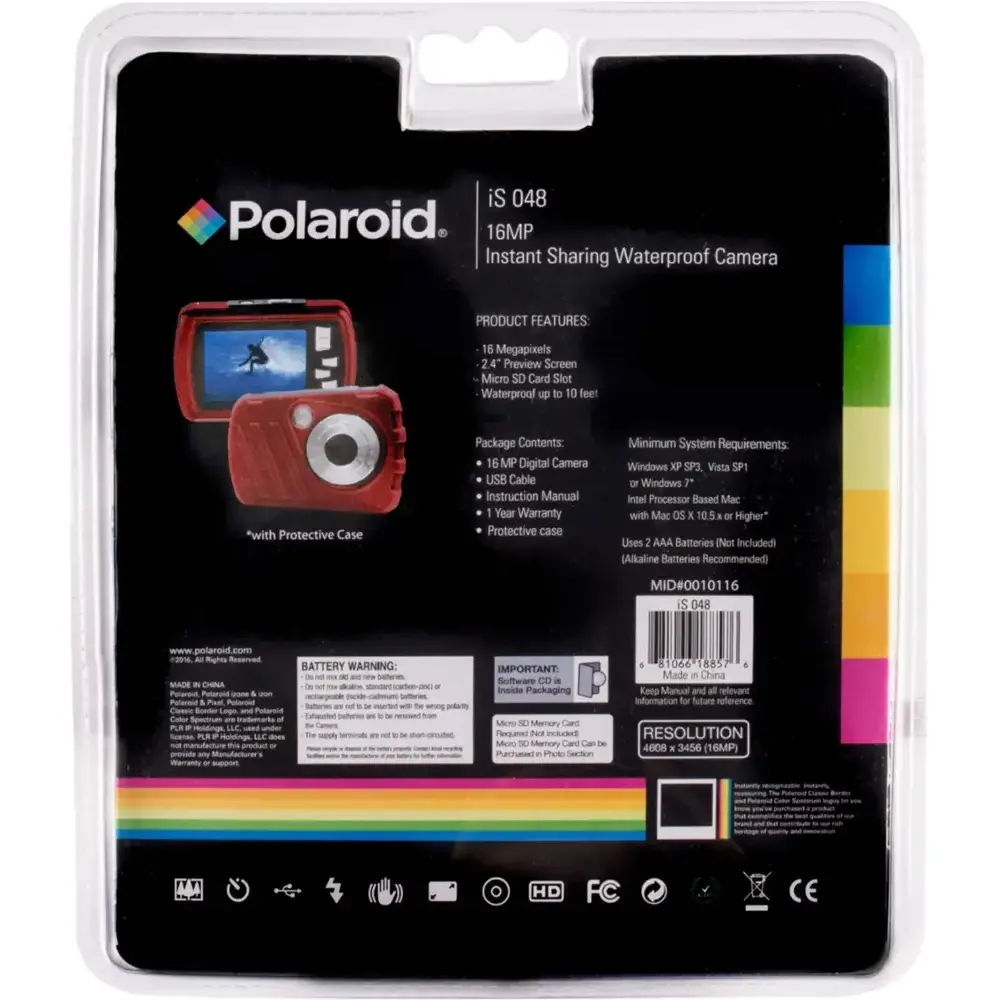 The Polaroid iS048 digital camera is the ultimate companion for adventures. With 16 MP, it lets you capture stunning images and preview them on the 2.4" screen. Compact and lightweight, it fits easily into your pocket, so you're always ready to capture the perfect shot—even underwater! Waterproof up to 10 ft, the iS048 lets you dive into pools or lakes without worry. Store your photos on a micro SD card (not included) for easy transfer to your devices and share your memories with family and friends.