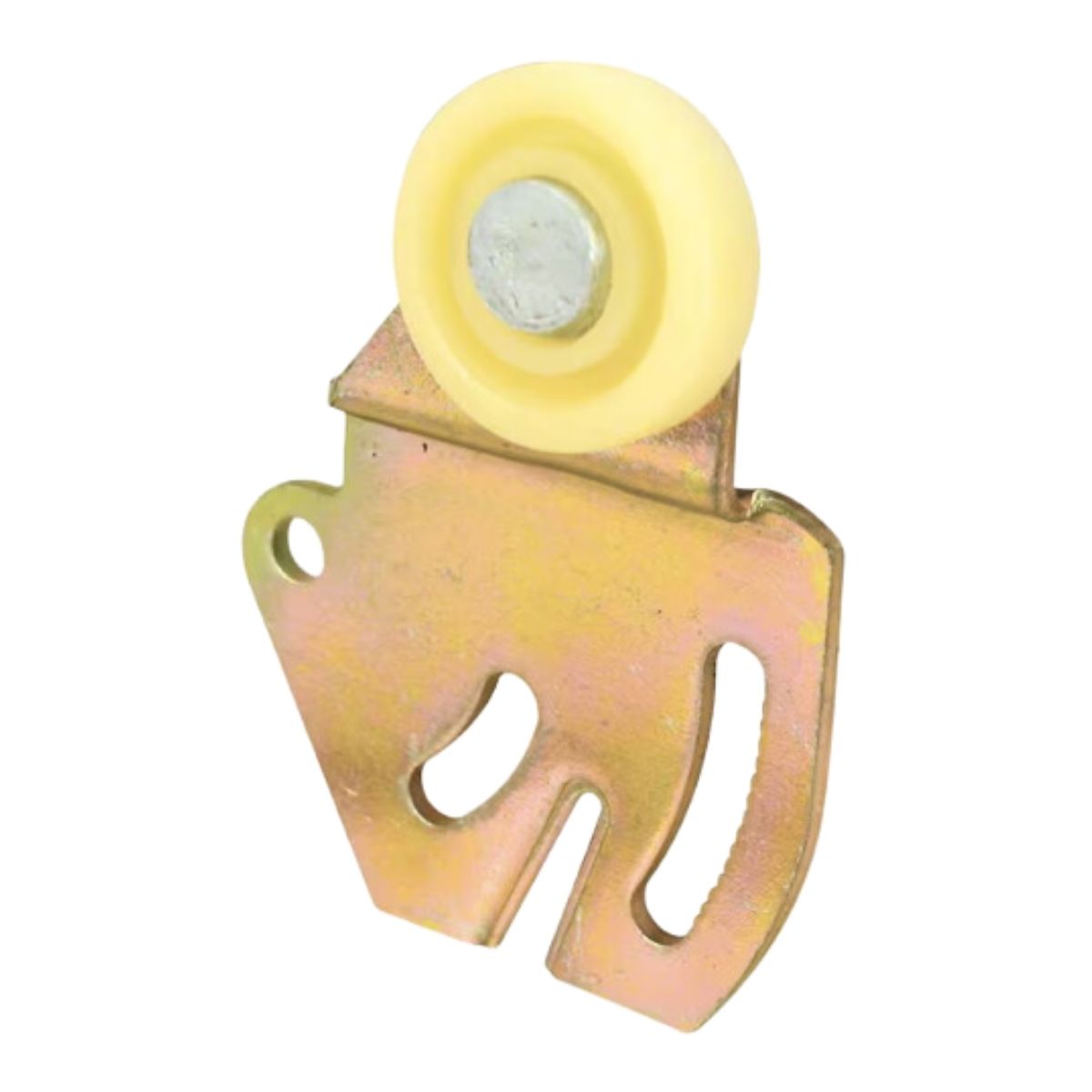This adjustable top-hung, side-mounted bracket features a 3/8 inch offset and a 7/8 inch flat nylon roller designed for use on the back of a sliding door panel. It is compatible with doors ranging from 3/4 inch to 1-3/8 inches in thickness and is commonly utilized in various sliding closet or wardrobe door applications.