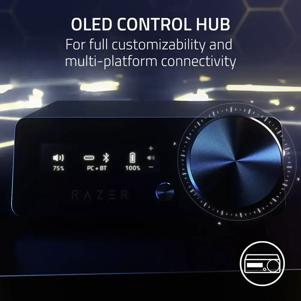 The Razer Kraken V4 Pro Wireless Gaming Headset offers seamless wireless connectivity across multiple platforms, including PC, Mac, PS5, Nintendo Switch, Steam Deck, and smartphones. It delivers an immersive audio experience with 7.1 surround sound, allowing you to fully engage in your games. The Razer Chroma RGB lighting adds a personalized touch with customizable color effects. Designed for comfort, it features soft ear cushions and an adjustable headband, ensuring a snug fit for long gaming sessions. Built with a durable yet lightweight design, it’s perfect for extended use. Additionally, the built-in microphone offers clear voice capture with noise-canceling capabilities, enhancing communication during gameplay.