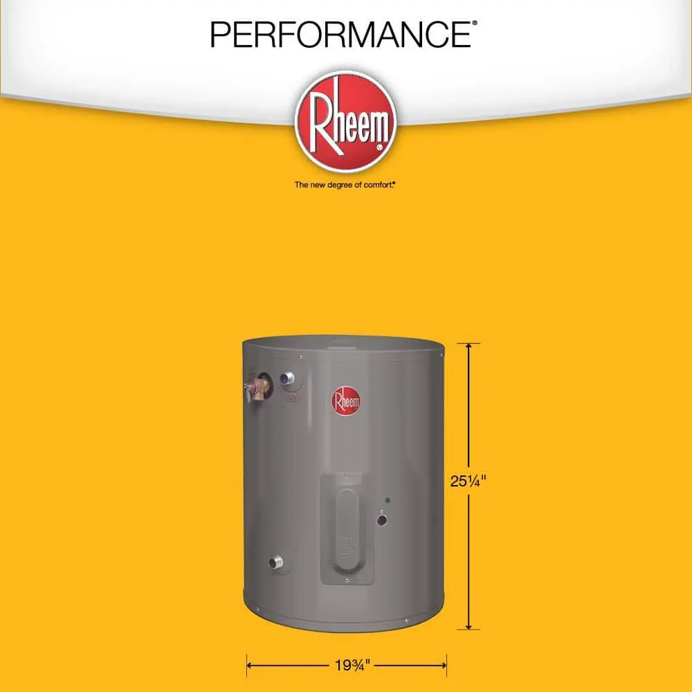 The Rheem Performance 20-Gallon Electric Point-of-Use Water Heater is designed for compact spaces, providing a reliable hot water source for a single application. It features a 2,000-watt heating element and a factory-installed temperature and pressure relief valve. This unit operates on a 120-volt electrical connection and can be wall-mounted for space efficiency.