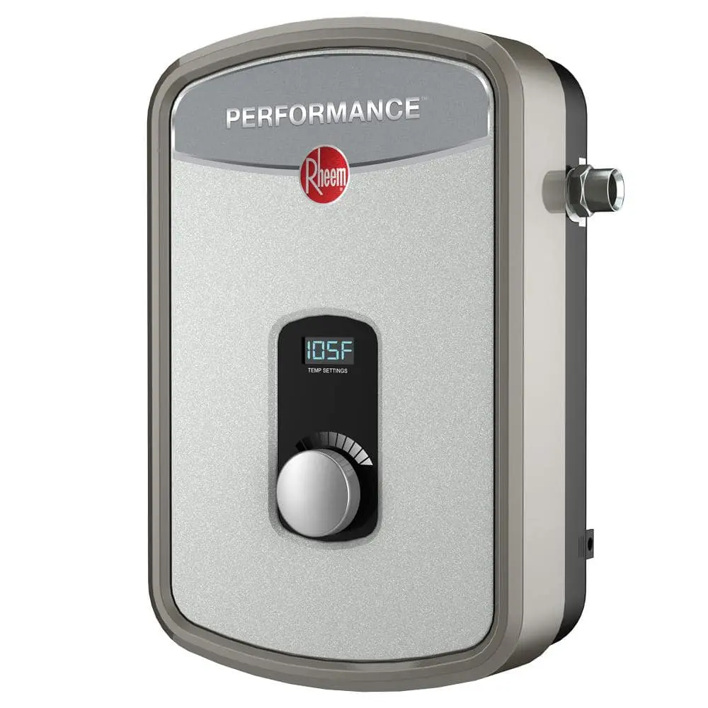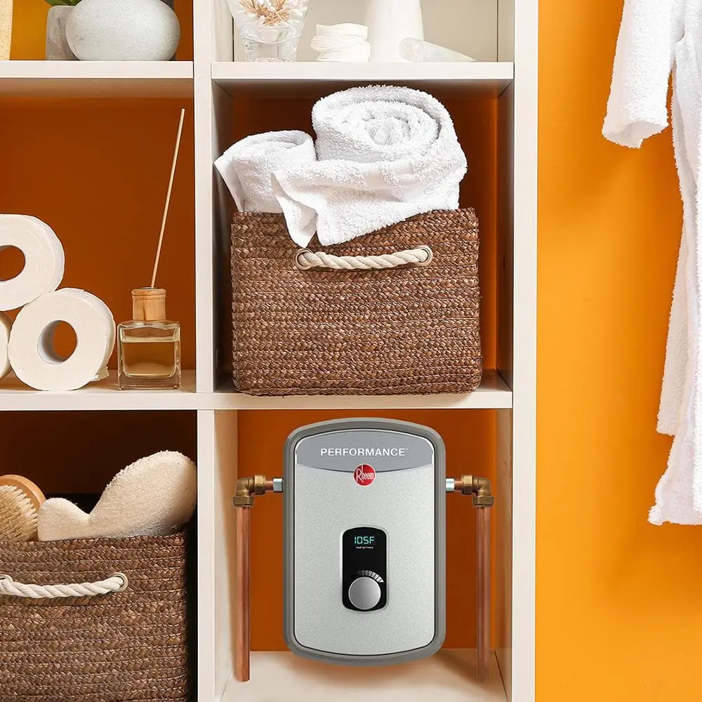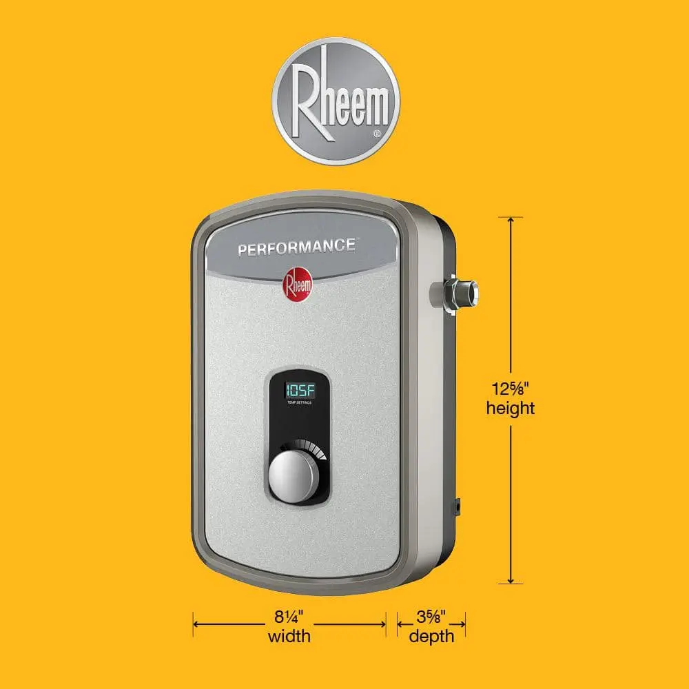 The Rheem Performance electric tankless water heater provides an efficient, on-demand hot water supply with self-modulating technology that adjusts energy use based on your needs. With its electronic thermostatic temperature control, you can easily set and read the water temperature in one-degree increments. Its compact, point-of-use design makes it an ideal solution for smaller spaces, such as under cabinets and sinks.