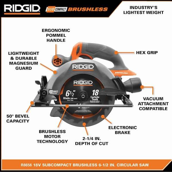 Featuring a robust brushless motor, it delivers up to 5,000 RPM and a 2-1/4 in. depth of cut, ideal for slicing through 2X material and triple-stacked in. OSB. With a 50 bevel capacity, it handles common cutting angles effortlessly. Compared to the R8657 Brushless 7-1/4 in. Circular Saw, it is 27% more compact and 30% lighter, making it perfect for quick and efficient cuts. Additionally, it is compatible with vacuum attachments for dust control, accepting 1-1/4 in. and 1-7/8 in. hose sizes.