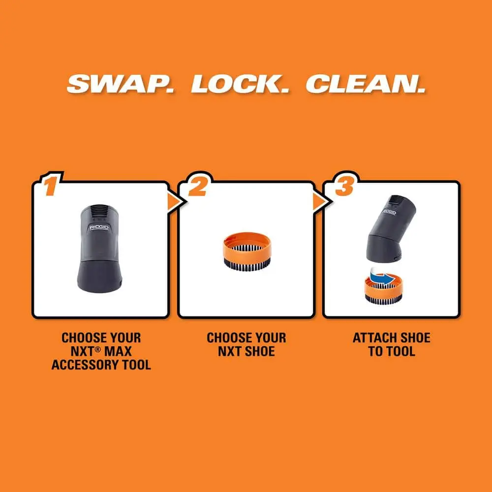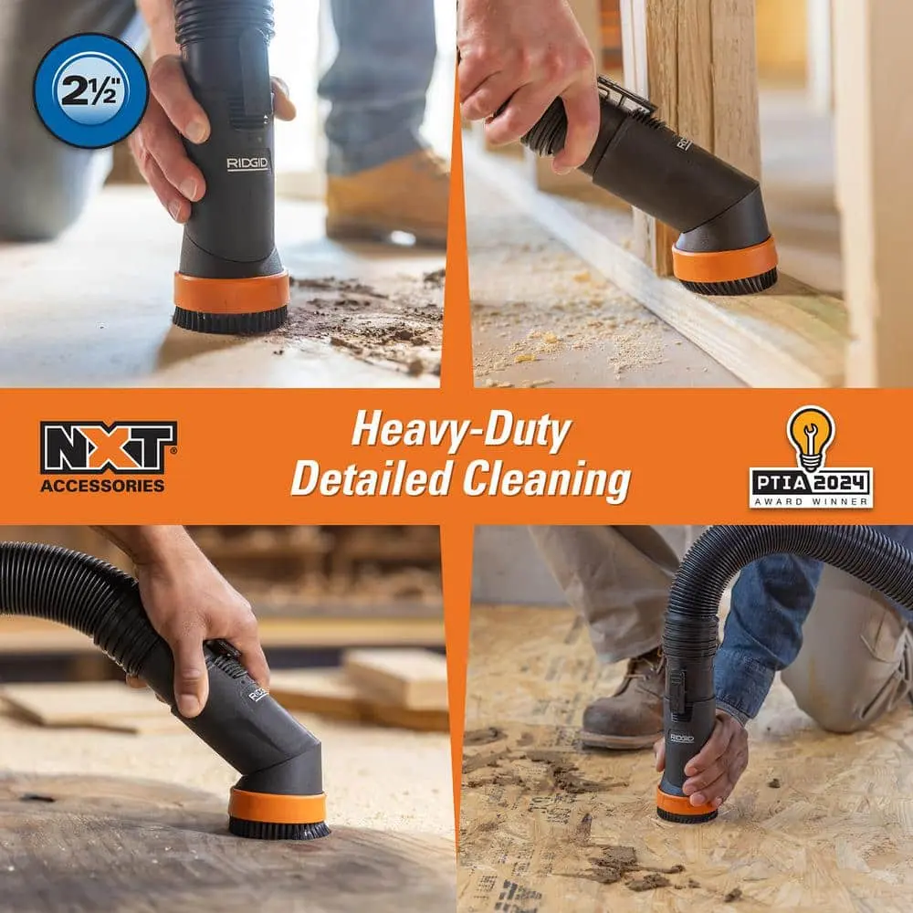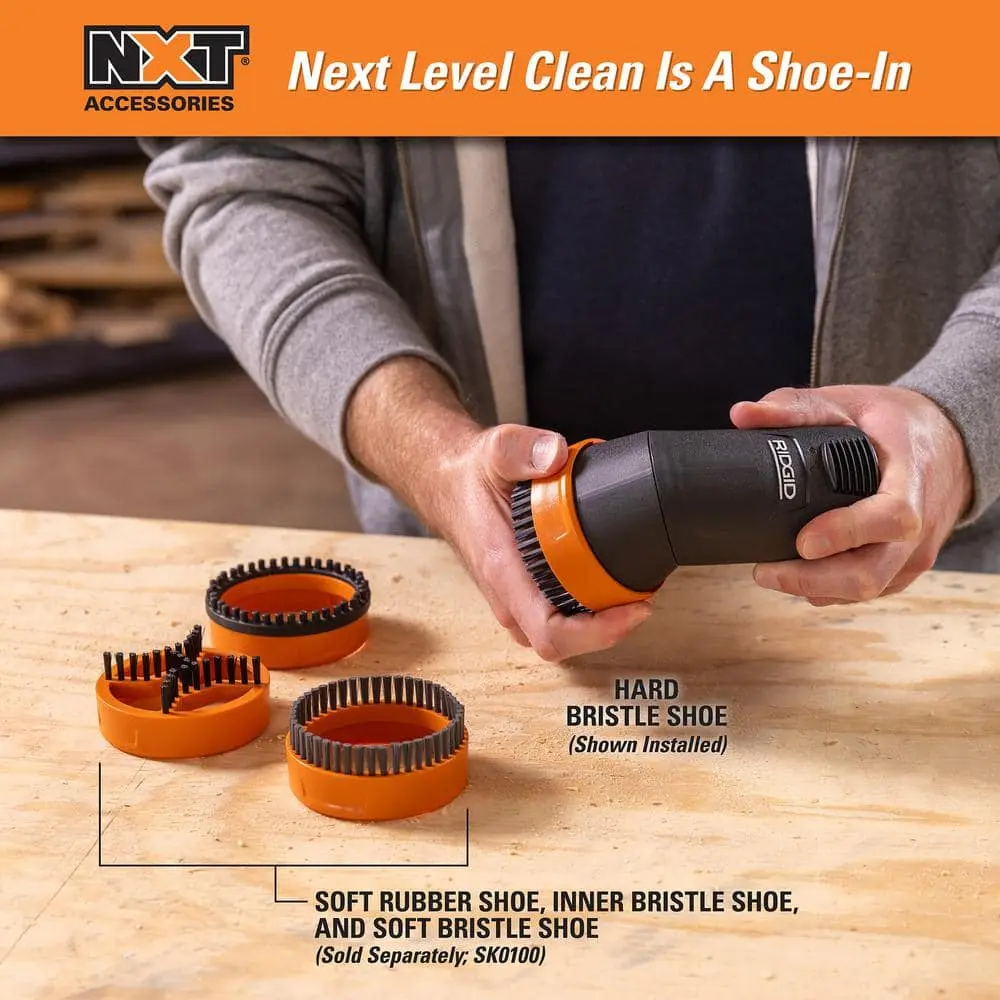 Upgrade your cleaning experience with the RIDGID NXT Max Locking Rotating Dusting Brush, designed for 2-1/2 in. accessories on RIDGID wet/dry vacuums. Part of the NXT Accessory Swap & Lock System, this tool features a 180-degree rotating head that locks into place for straight or angled cleaning. The included Hard Bristle Shoe effectively removes stubborn debris from various surfaces like workbenches, car interiors, and floors. Compatible with additional interchangeable shoes (sold separately) for customized cleaning.