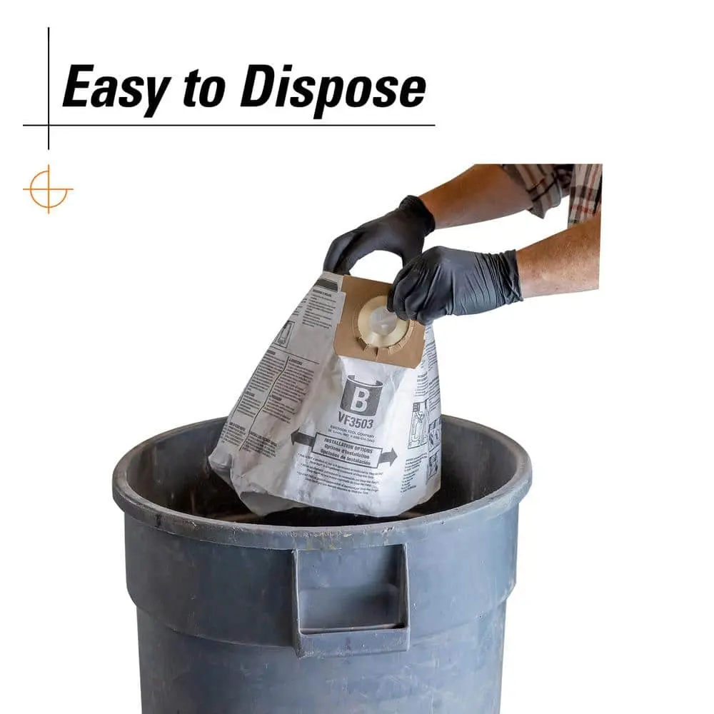 The RIDGID (size B) wet/dry vacuum dust bags are perfect for keeping your cleanup process neat and easy. This 2-pack ensures you’re prepared for large cleanups, with quick disposal at your fingertips. Compatible with most 5 to 10 gallon RIDGID wet/dry vacuums (excluding the 6-gallon NXT model), these bags efficiently collect fine debris like drywall dust, preventing a messy drum. Simply remove and discard the bag for an easy cleanup—no need to lift the drum. These high-efficiency dust bags help extend filter life by reducing clogs, enhancing vacuum performance. Pair with a RIDGID filter (sold separately) to further optimize cleaning. Available in various pack sizes (6-count, 12-count, 24-count, and 36-count) to fit your project needs. Installing and removing the bags is a breeze—just align the collar with the inlet and press it against the vacuum drum.