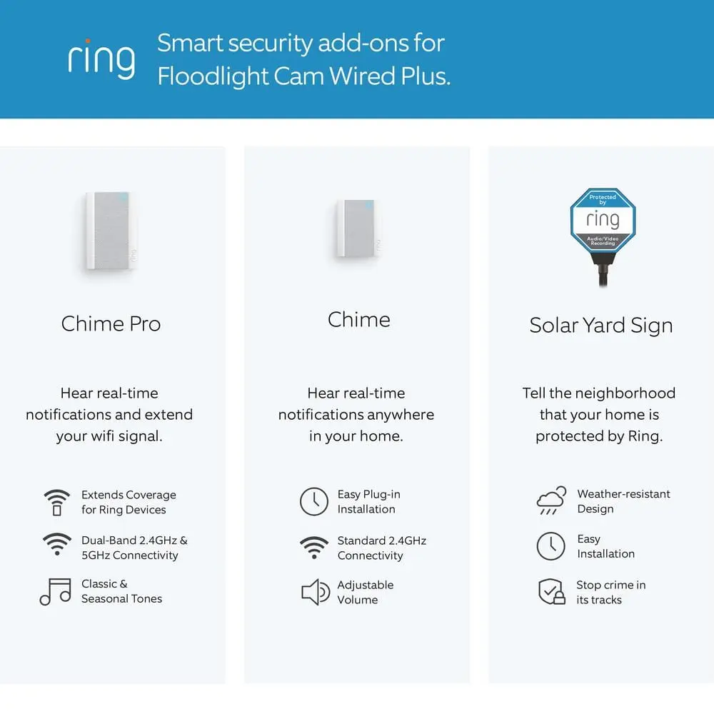 The Floodlight Cam Wired Plus is the upgraded version of our bestselling Floodlight Cam, designed to provide enhanced security for large outdoor spaces like driveways, garages, and backyards. Equipped with motion-activated LED floodlights, 1080p HD video, and a built-in security siren, this camera helps you monitor your property with clarity and confidence. Customize motion detection zones to focus on key areas and receive real-time notifications when movement is detected. With the Ring App, you can view live footage, control the lights, communicate with visitors, and activate the siren when needed.