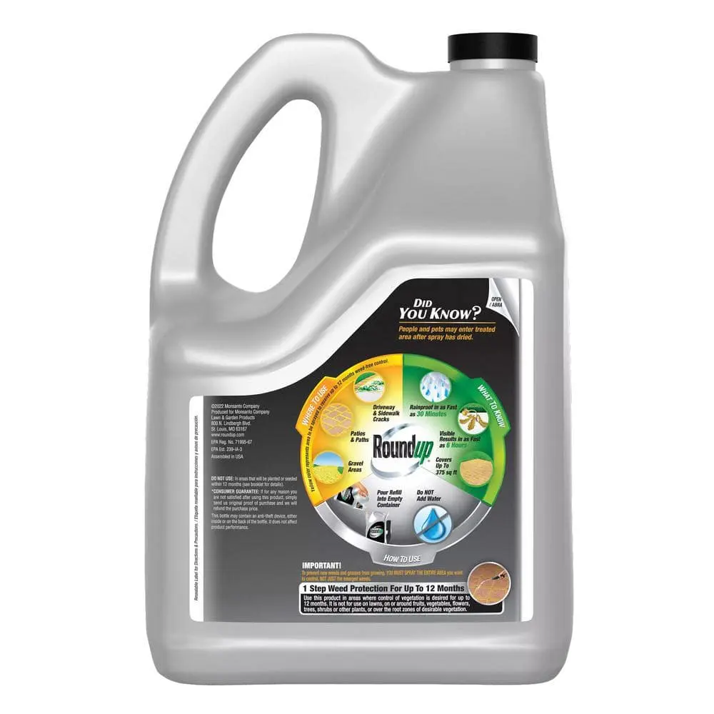 Roundup Dual Action 365 Weed and Grass Killer Plus 12-Month Preventer offers effective, one-step weed control for up to a year. It targets and eliminates a variety of tough weeds, including clover, dandelion, crabgrass, poison ivy, and other broadleaf and grassy weeds. This product works fast, showing visible results within hours and is rainproof in just 30 minutes. Ideal for areas like driveways, sidewalks, patios, and gravel zones, it both kills existing weeds and prevents new ones for up to 12 months. The refill container provides an easy way to replenish your supply—just pour into an empty container without adding water. To ensure complete weed prevention, spray the entire area, not just the weeds. The 1-1.25 gallon container covers up to 375 square feet.