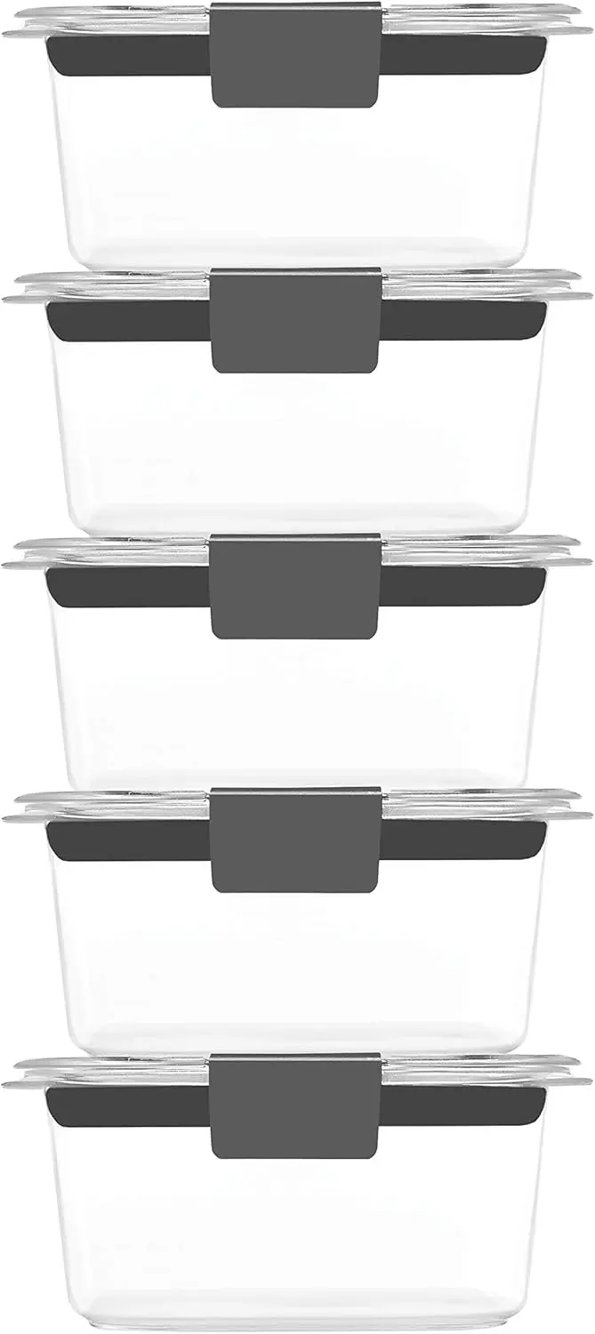Rubbermaid Brilliance food storage containers are 100% leak-proof and airtight, made from crystal-clear, BPA-free Tritan plastic for 360-degree visibility. They are lightweight, stain- and odor-resistant, and allow for splatter-resistant microwave reheating with the lid on. The stackable design saves space, and theyre safe for the dishwasher and freezer. The set includes five 1.3-cup containers with lids (10 pieces total).