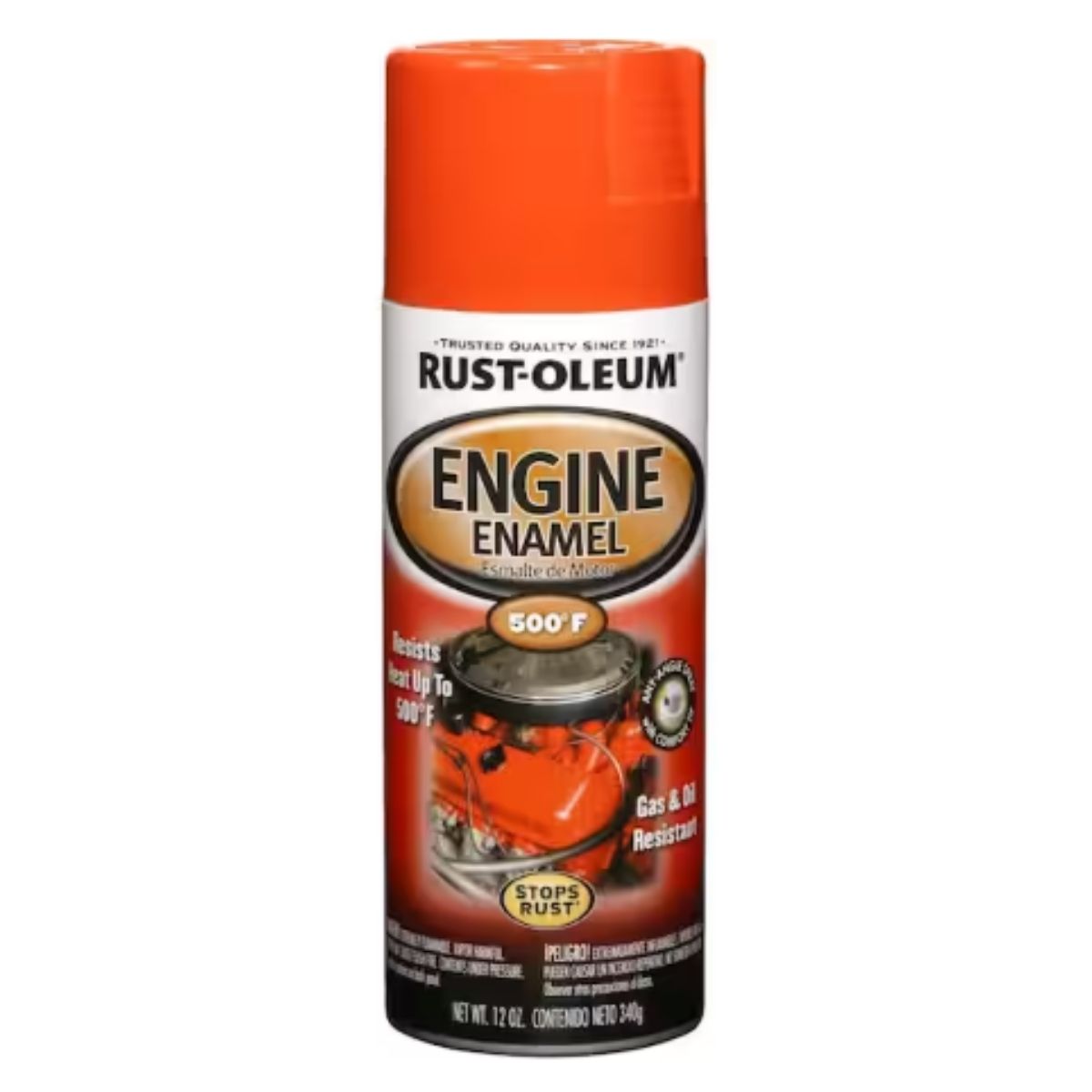 Rust-Oleum Engine Enamel is designed for automotive engines and other surfaces subjected to intermittent temperatures up to 500 degrees F (260 degrees C), providing a smooth finish. Its oil-based formula resists chipping and peeling, delivering a glossy finish with excellent color and gloss retention, drying in as little as 20 minutes. Each 12 oz. can covers up to 10 sq. ft. and features Any-Angle Spray Technology with a comfort tip for ease of application. The paint includes Rust-Oleum's Stops Rust formula for durable rust prevention and can be cleaned up with mineral spirits. It offers superb UV and weather resistance, though actual paint colors may vary from on-screen and printer representations.