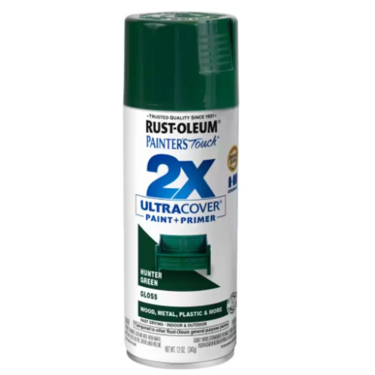 Introducing Rust-Oleum Painter's Touch Ultra Cover 2X 12 oz. Gloss Hunter Green General Purpose Spray Paint, engineered to provide double the coverage compared to other Rust-Oleum general purpose paints. Featuring advanced double cover technology, this paint ensures rapid project completion, while its paint and primer formula offers superior hiding power and durability. Suitable for both interior and exterior applications on various surfaces such as wood, metal, and plastic, it covers up to 12 sq. ft. per can. The glossy finish adds a vibrant shine to surfaces, enhanced by the comfort spray tip with a wider finger pad that reduces fatigue and enables 360-degree, any-angle spray application. Drying to the touch in just 20 minutes, its oil-based formula includes double cover technology for efficient coverage and combines paint with primer for added convenience.