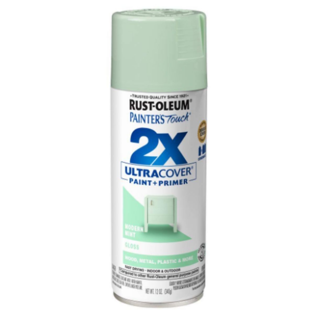 Rust-Oleum Painter's Touch Ultra Cover 2X 12 oz. Gloss Modern Mint General Purpose Spray Paint stands out with its innovative double cover technology, providing twice the coverage compared to other Rust-Oleum general purpose paints. This allows for swift project completion while ensuring exceptional hiding power and durability thanks to its integrated paint and primer formula. Suitable for both interior and exterior use on various surfaces such as wood, metal, and plastic, it offers long-lasting protection against the elements. The glossy finish adds a fresh shine to surfaces, complemented by the any-angle spray system that enables spraying in any direction, including upside down, for reaching difficult areas. With a quick drying time of just 20 minutes, the oil-based formula facilitates efficient application. Cleanup is easy with mineral spirits, making it a versatile choice for achieving professional-quality results in DIY projects or larger applications.